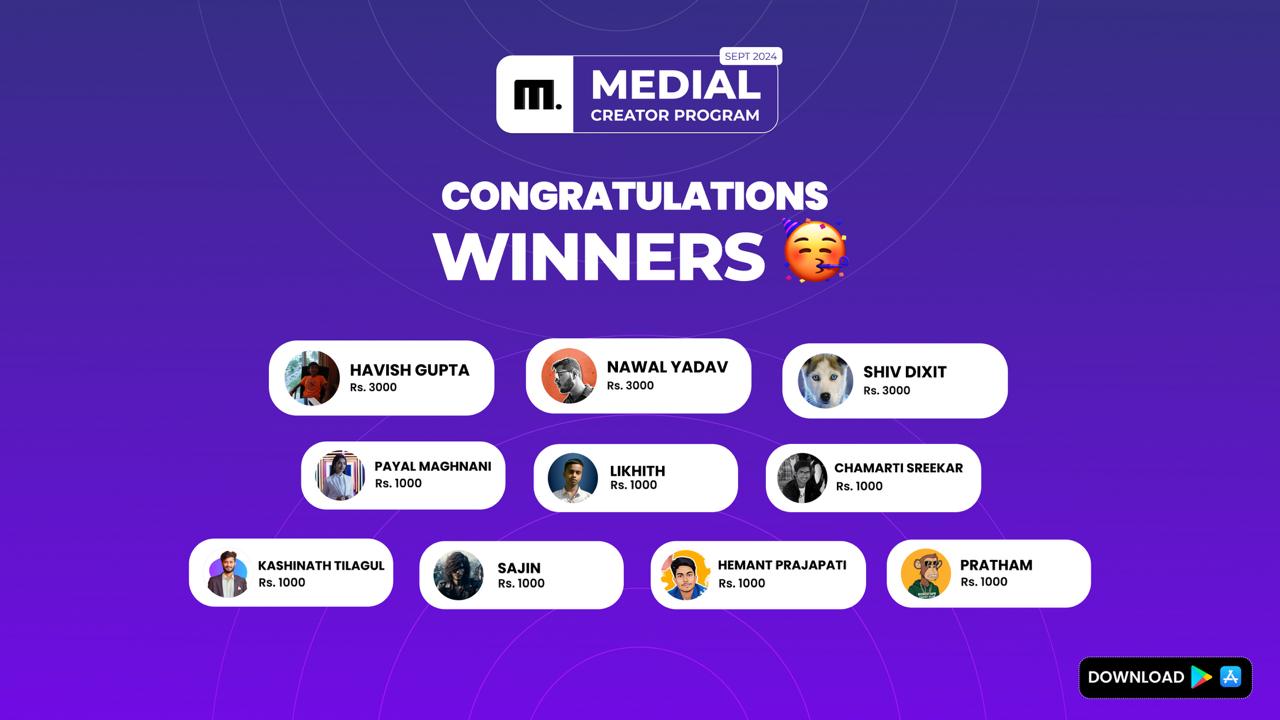 Announcing the winners of Creator Program (September 2024)- We had a great month of crazy content and information being shared on Medial and we're glad to recognise the top contributors! Top 3 who won Rs. 3k each- 1) Havish Gupta 2) Nawal Yadav