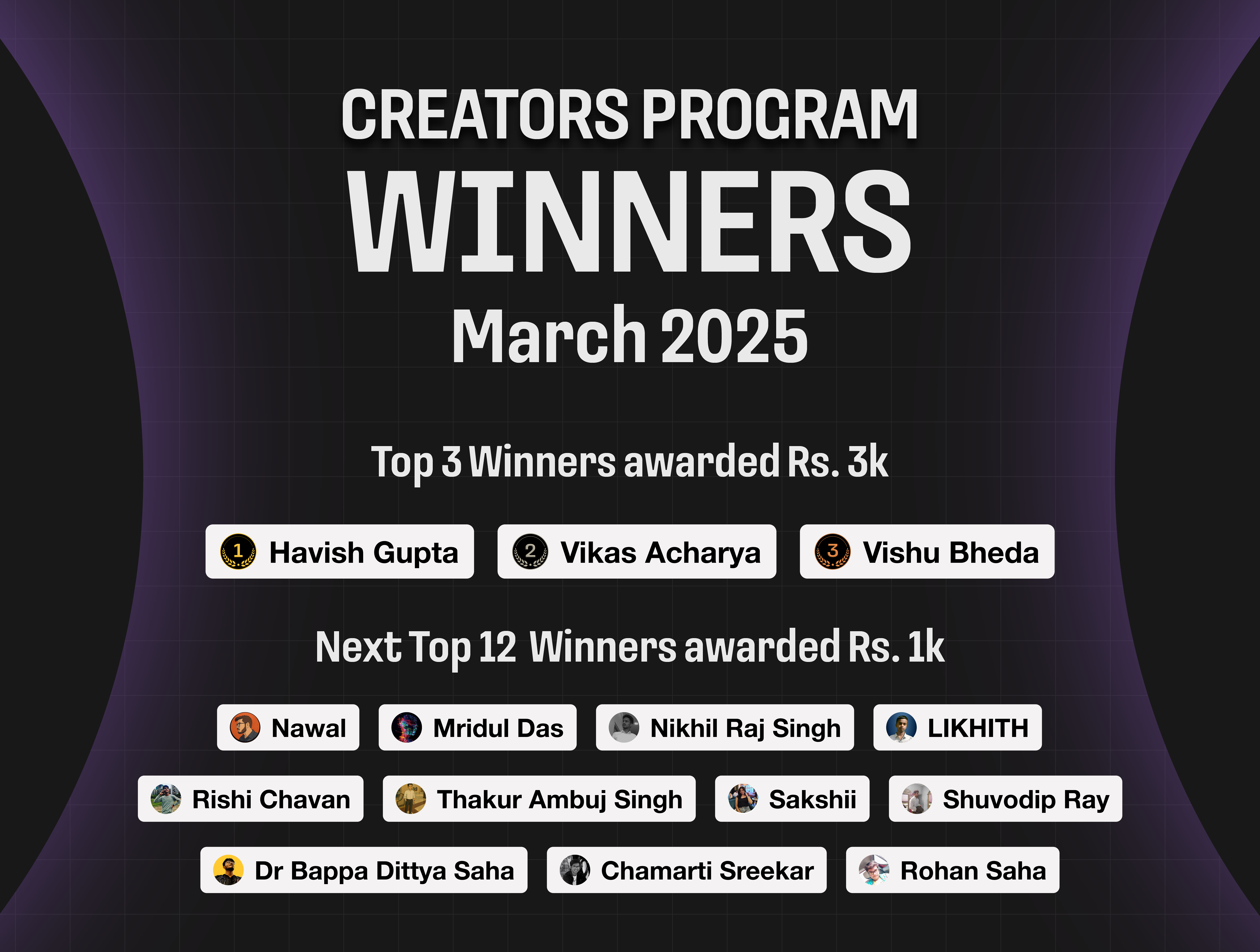 Winners of the Creator Program March 2025 are here! First three to win 3k each- Havish Gupta Vikas Acharya Vishu Bheda Next to win 1k each! Nawal, Mridul Das, Nikhil Raj Singh, LIKHITH, Rishi Chavan, Thakur Ambuj Singh, Sakshii, Shuvodip Ray, Dr B