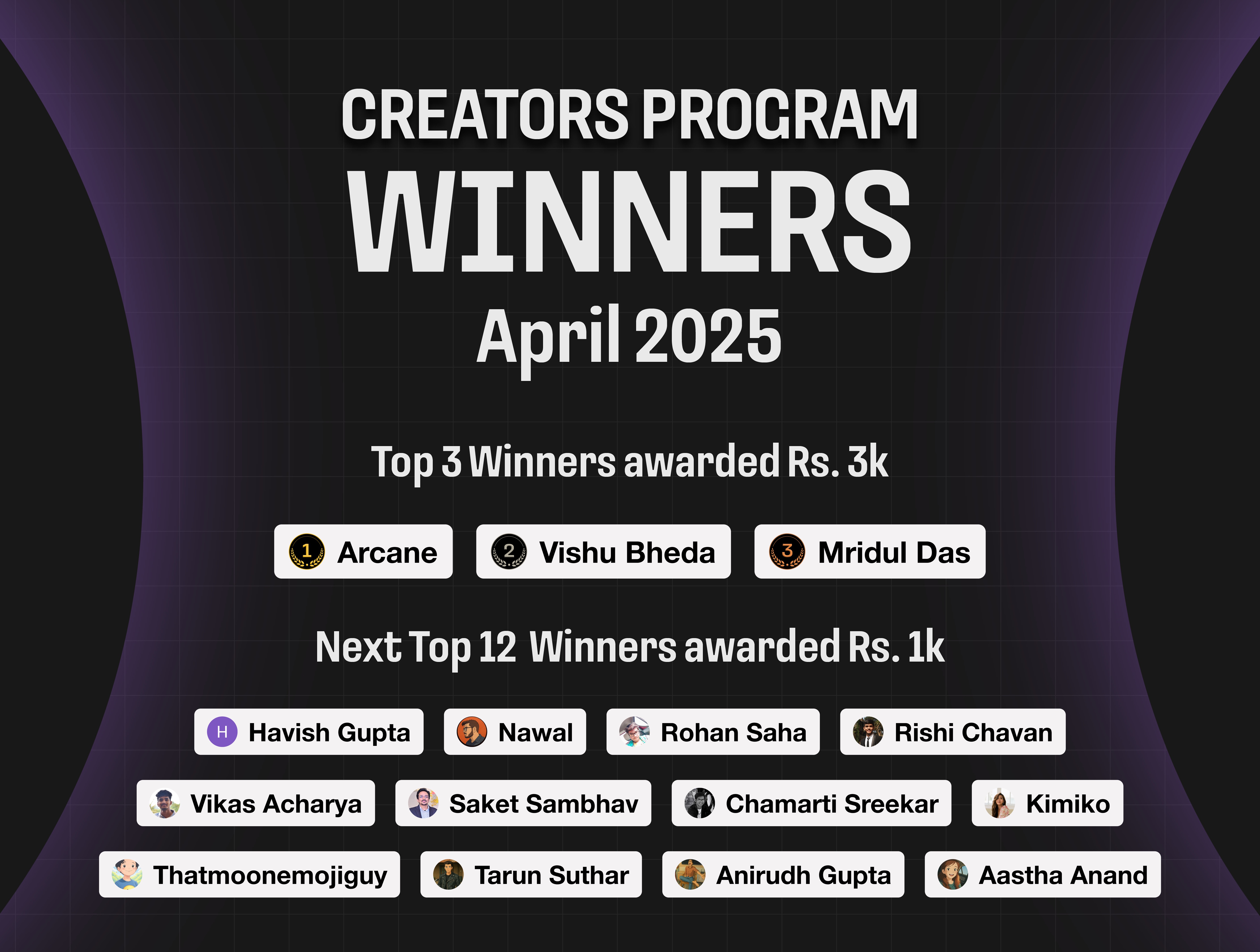 Winners of the Creator Program April 2025 are here! First three to win 3k each- Arcane Vishu Bheda Mridul Das Next to win 1k each! Havish Gupta Nawal Rohan Saha Rishi Chavan Vikas Acharya Saket Sambhav Chamarti Sreekar Kimiko Thatmoonemojiguy T