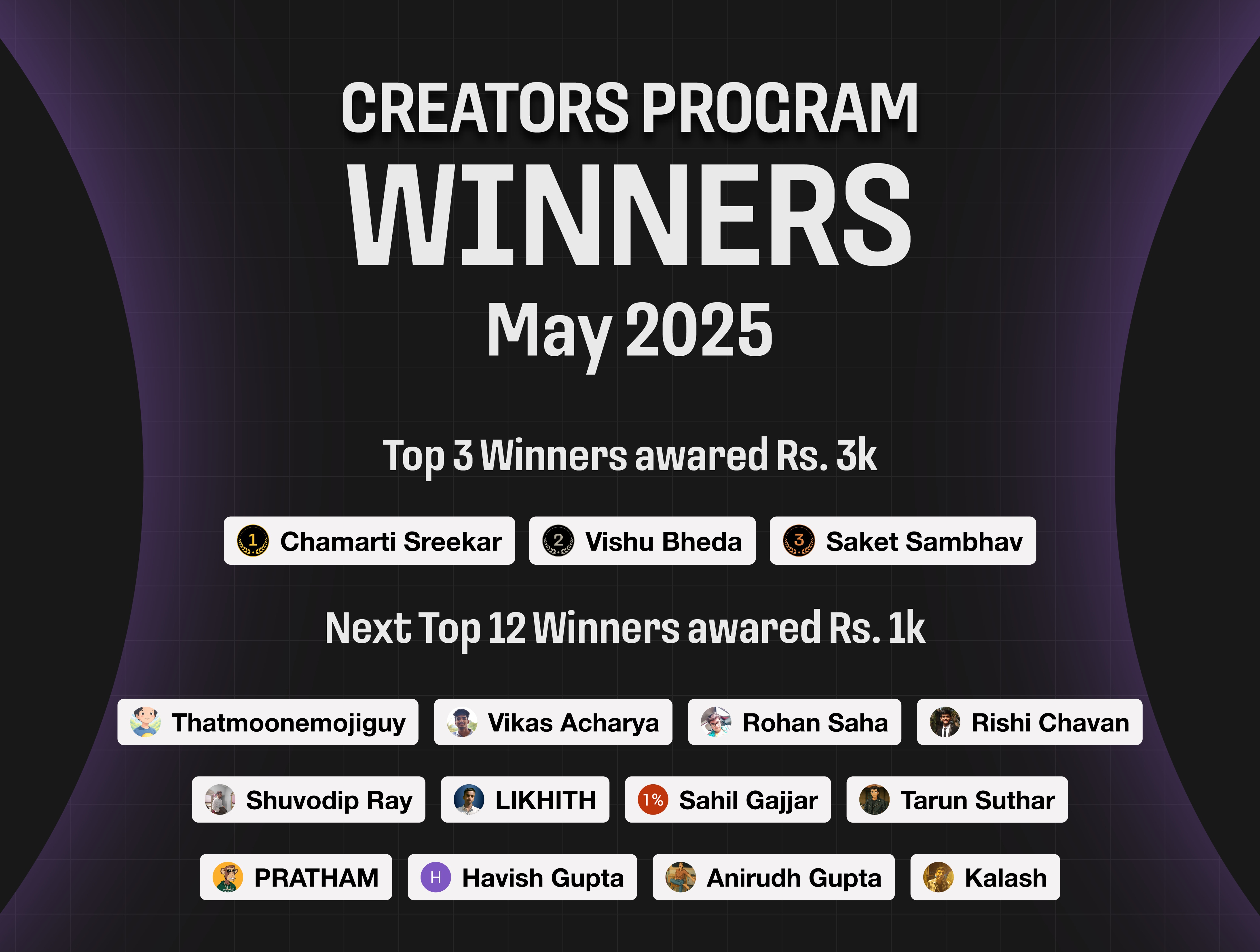 Winners of the Creator Program May 2025 are here! First three to win 3k each- Saket Sambhav Vishu Bheda Chamarti Sreekar Next to win 1k each! Thatmoonemojiguy , Vikas Acharya Rohan Saha, Rishi Chavan , Shuvodip Ray, LIKHITH, Sahil gajjar, Tarun