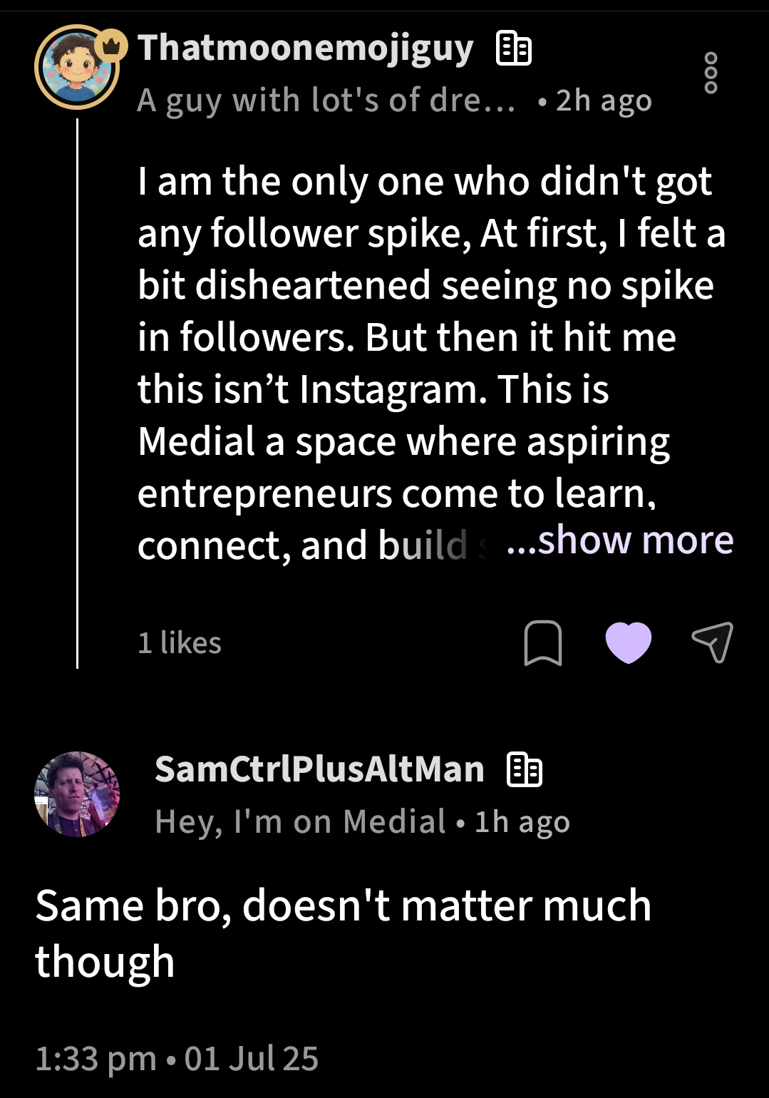 Appreciation post for two of the most important users on Medial. SamCtrlPlusAltMan and Thatmoonemojiguy - You both are ASSETS to Medial community. ๐ Since I joined this platform, I am watching your posts and, specially, comments. They are really