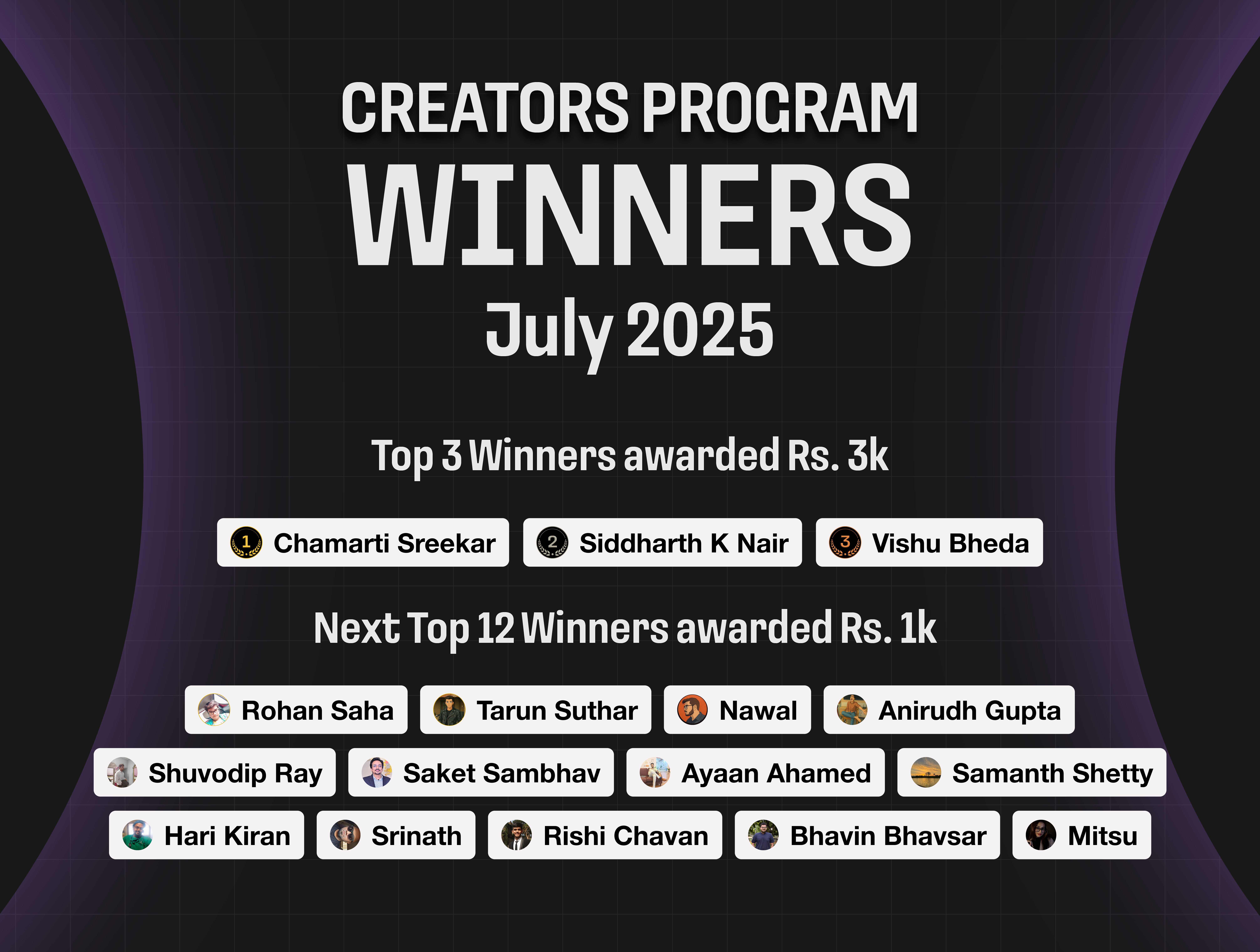 Creators Winners Announcement: Winners of the Creator Program July 2025 are here! First three to win 3k each- 1. Chamarti Sreekar 2. Siddharth K Nair 3. Vishu Bheda Next 12 people to win โน1,000 each are mentioned in the pic below! ๐ Congratu