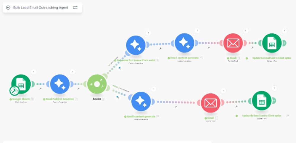 🚀 Just built a new automation with Make.com and AI — a Bulk Lead Email Outreach Agent. It automates the full cold email flow: ✔️ Pulls lead data from Google Sheets ✔️ Generates personalized subject lines ✔️ Extracts first names (with smart fallba