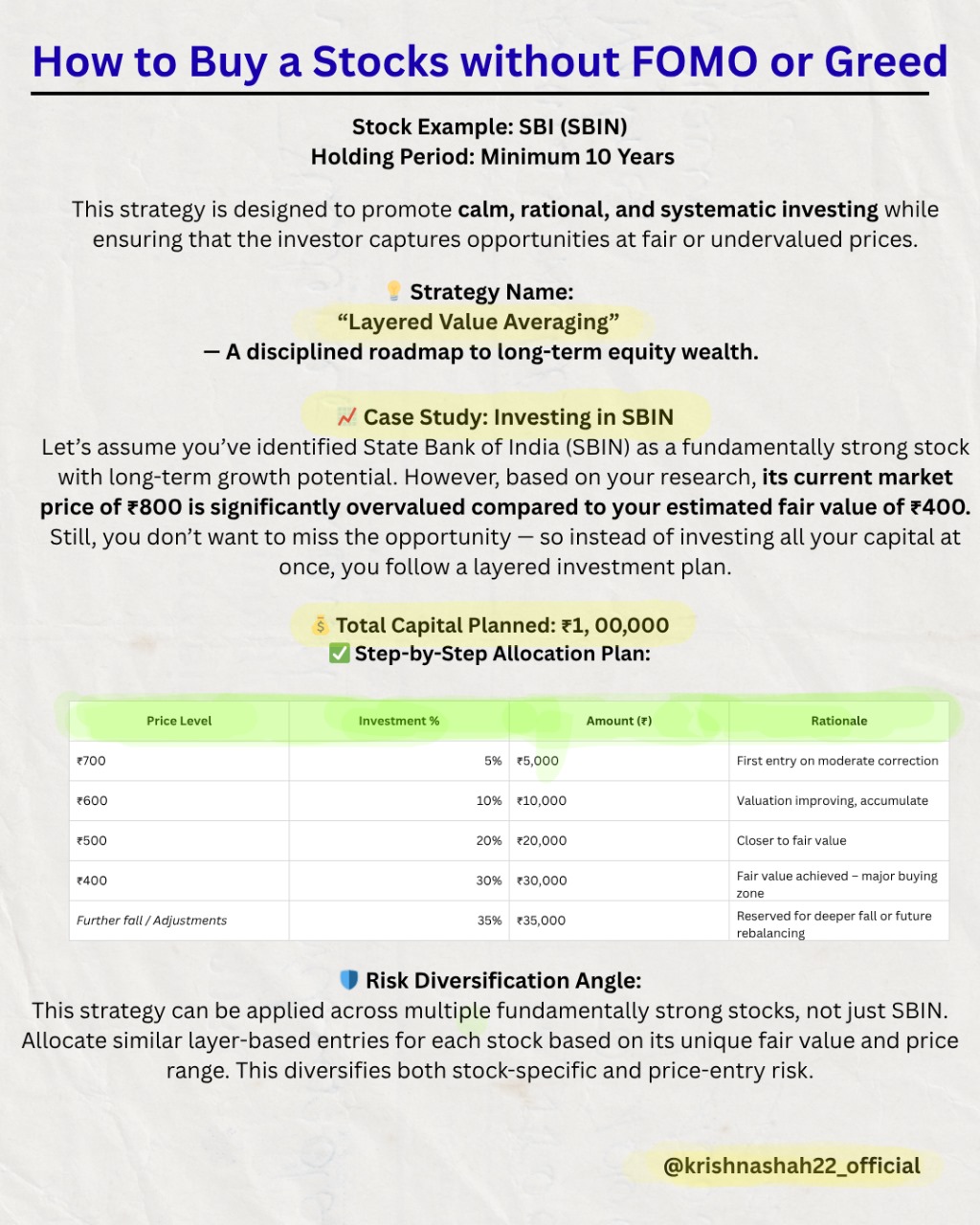 💡 Investing without FOMO? Here’s how I buy long-term stocks like SBI calmly — without chasing price or panicking in corrections. 🔸 Strategy: Layered Value Averaging 🔸 Entry zones based on valuation 🔸 Emotion-free, disciplined, and peaceful investing 📌 Start investing with clarity. — Krishna Shah | 8454966463