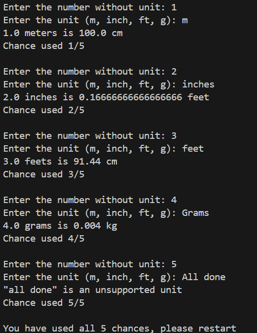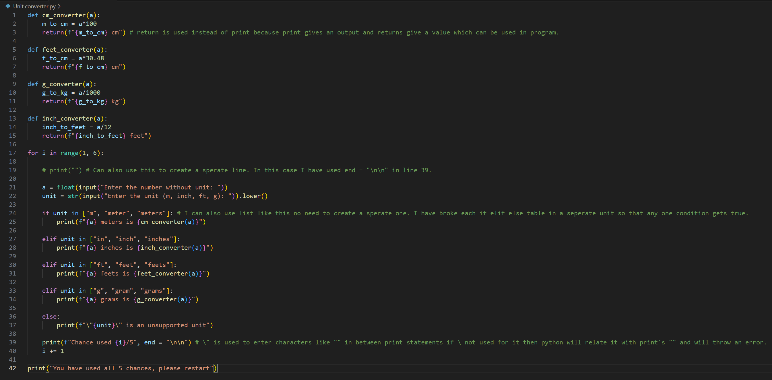 Day 5 of learning python as a beginner. Topic: Functions On my previous day post many people shared their github where I was introduced to def functions and since then I started learning more about def functions. Thank you all those people who are supporting and guided me. def functions are user defined functions which you can reuse in your code again and again without repeating the logic. Python has two types of functions pre-defined (ex- sum(), max(), etc) and user-defined (which user creates himself think of it like reusable components). I have created a unit converter using def function. First I have created reusable code logic for conversion formulas. I have used replace in place of print because it shows result on screen (console output) and will return "none" when called in the def function however on the other hand return sends the result back to the caller (which can be used later). Then I have let user enter a number (without unit) and then the unit seperately (if user put unit in the first input then it will be treated as a string and formulas will not work, thus giving an error). Then I used a list directly in if else statement (I didn't know that list can also be used directly in if else) and I created 4 such lists of different units so that any one condition can become true in if elif and else table. I hope I am able to explan this code without making it complex. I would appreciate any challenge or suggestion to improve my code. And here's my code and it's result.