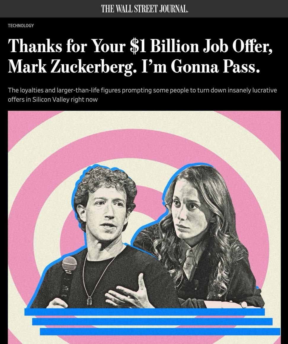 ♾️ In 2006, Zuck once turned down $1B for Facebook because he believed in his vision. Now, he’s offering $1B+ to top AI talent—and they’re turning him down for the same reason. In the end, loyalty and mission still matter most in tech.