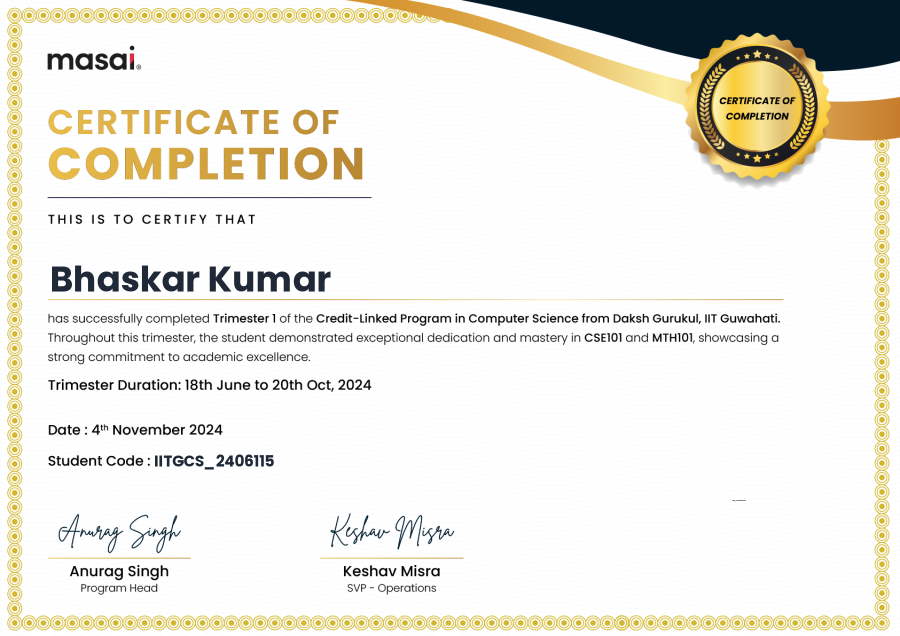 Excited to share that I have successfully completed Trimester 1 of the Credit-Linked Program in Computer Science at Daksh Gurukul, IIT Guwahati! This journey has been both challenging and rewarding, filled with valuable learning experiences and oppo