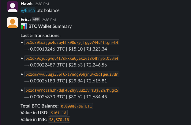 Another day, another automation. Erica just got an upgrade. She now tracks your BTC wallet like a pro: โ Fetches live balance โ Displays your last 5 transactions โ Converts BTC to both USD & INR โ Posts real-time summaries on Slack Automation isn't just about saving time. It's about building leverage.