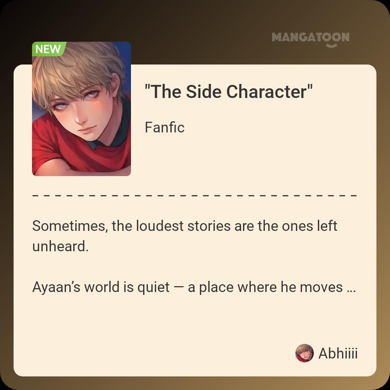 NEW STORY ALERT! Title: โThe Side Characterโ Genre: Fanfic By: Abhiiii โSometimes, the loudest stories are the ones left unheard.โ Meet Ayaan โ not the hero, not the villain, but the one whoโs always in the background. His world is quiet. His prese
