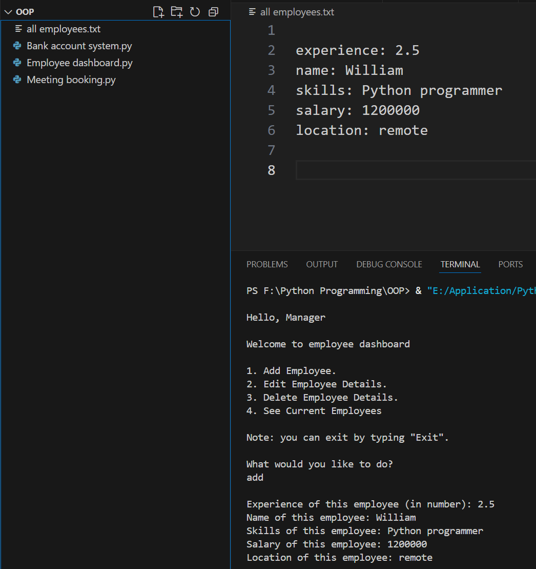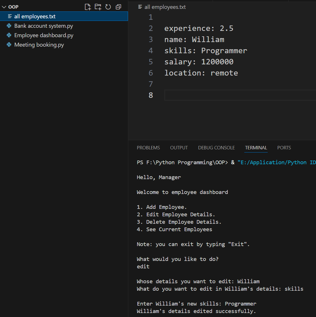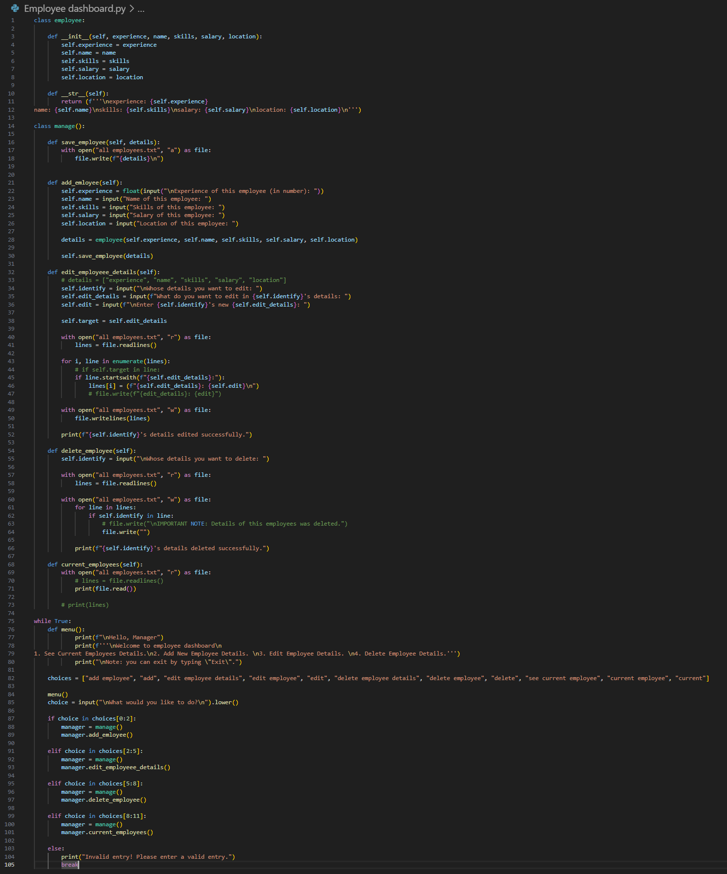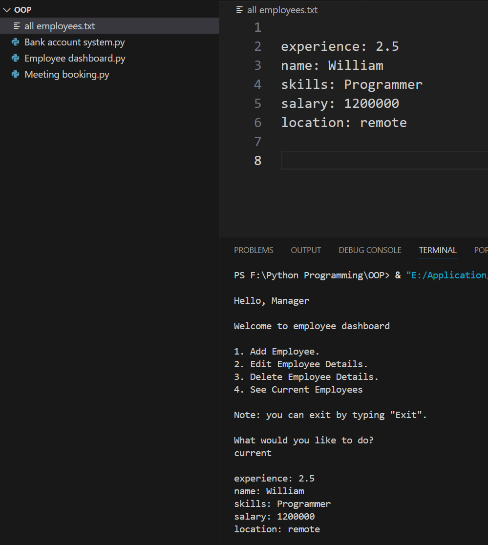 Day 14 of learning python as a beginner. Topic: final practice of classes by creating an employee dashboard. I know you guys may have become bored seeing me talking about only classes however since a day or two, I was just practicing because I felt like I should know classes in more details today I have created an employee dashboard as a final practice of classes and know I think I got an idea about how to use classes. Please do tell me if you guys think I am not as ready as I think I am. Also during the process I got introduced with inheritance in class (I didn't use inheritance here because I wasn't able to find their exact use case here, do suggest me it there is). Inheritance are of three types: Single Inheritance: One child class inherits from one parent class. Multiple Inheritance: One child class inherits from more than one parent class. Multilevel inheritance: A chain of inheritance: child inherits from parent, which inherits from another parent. This time in my program I have also added an ability to edit the details using python File I/O. I created four methods for adding an employee, editing his details, seeing the current details and deleting the details. Then I used my if elif else ladder to call the respective function according to user's input I used a list to compare user's different responses and also wrapped all this ladder in a while loop so that user can repeat the program as long as he wants and exits whenever he feel like he's done with it. I would warmly welcome all your guys suggestions to make my code better and improve my knowledge. I know guys I am not able to reply to many of you people's comments filled with amazing suggestions and questions because I am working on preparing a little gift for you people because you all had and continued to guide me for so long that I feel like I should also provide some positive value (I don't know if it will be up to your expectations or not but still I will give my best) in your life as well.