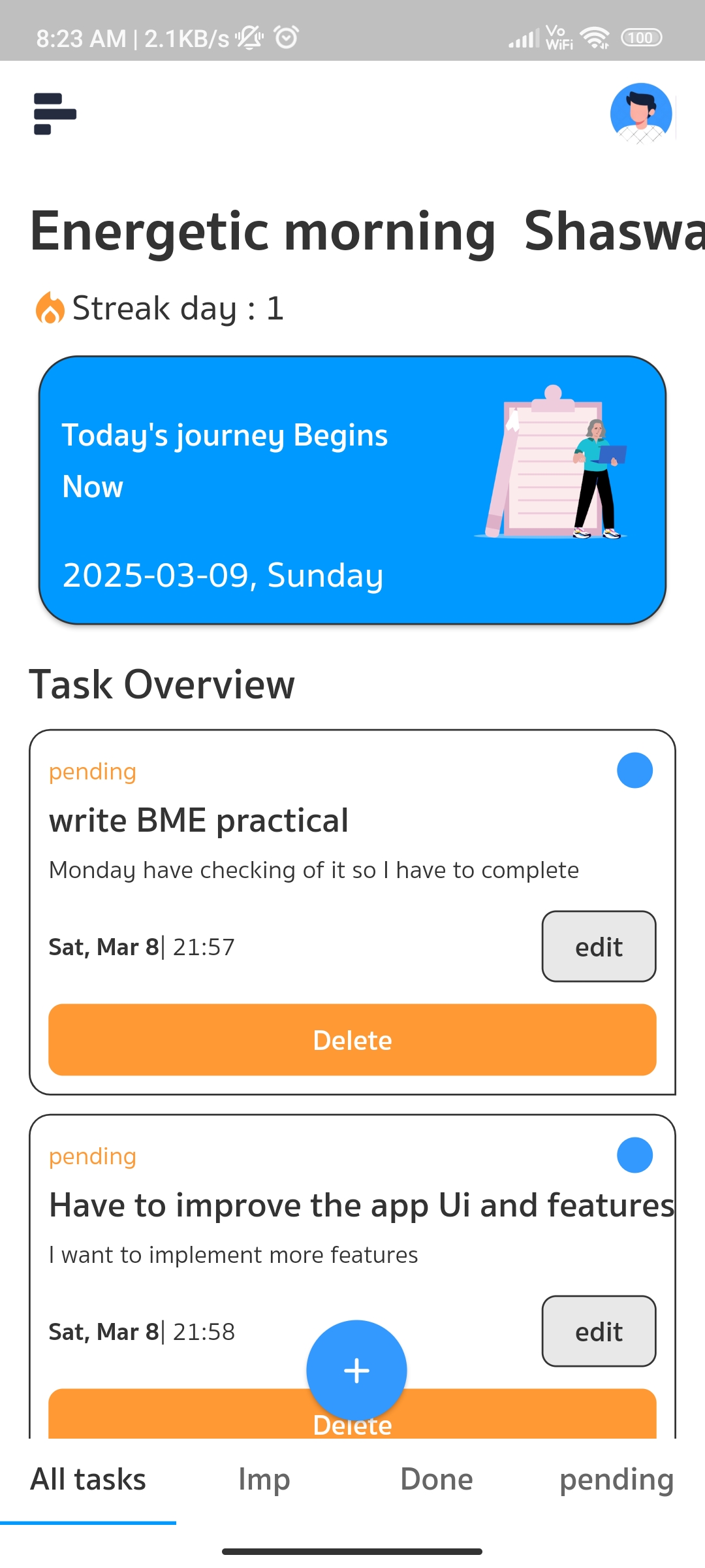 Glad to share that, I created a whole full stack task manager app but here is a twist it has a daily reminder Daily motivational notification in the morning to stay energetic. have integration with firestore for cloud massaging And mainly the ap