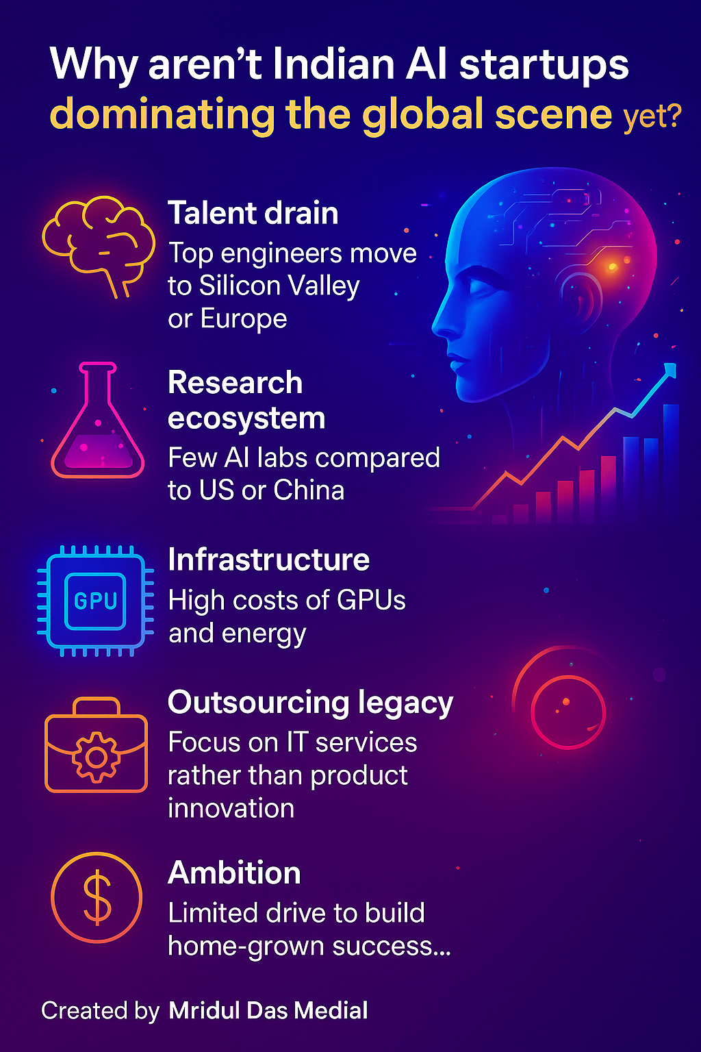Why aren't Indian AI startups dominating the global scene yet? As someone who's watched the tech world closely, let's break it down - India boasts insane talent pools from IITs and beyond, but we're still playing catch-up. Here's the real talk on what's holding us back. First off, talent drain is brutal. Our top engineers flock to Silicon Valley or Europe for better research ops and pay. Why grind in India when FAANG dangles green cards? This brain exodus leaves local startups short on cutting-edge innovators. It's like having star players but no home team. Adding to that, our research ecosystem is tiny compared to the US or China. Competitive exam toppers chase finance or product gigs, not AI labs. Investors here crave quick cash flows, so they fund safe bets like apps over risky base models. No wonder we have zero major LLMs – all the action's in applied AI, not foundational stuff. Then there's the infrastructure crunch. GPUs are gold dust, and energy costs make training models a wallet-killer. Half the population can't afford AI-native builds because the market's price-sensitive. We're stuck fine tuning foreign tech instead of inventing our own. Don't get me started on the outsourcing hangover. Decades of IT services made us masters of arbitrage – cheap talent for global clients. But that bred a service mindset, not product innovation. Firms like Infosys debug code, not disrupt markets. We're clones of Western models, not leaders. Funding's another sore spot. While OpenAI raises billions, Indian VCs play it safe, backing domestic plays with slow sales cycles. Risk-averse enterprises here demand endless PoCs without paying up. Startups pivot global early, but that skips building a strong home base. Ambition levels? Hot take: We're rate-limited by drive, not just brains or bucks. Valley thrives on high-stakes vibes and early adopters. Here, isolation kills momentum – you need a tribe to sustain big dreams. Many founders bolt for the Bay where prizes are fatter. Data and R&D gaps widen the chasm. India's languages and structural hurdles make foundational models tough. No massive datasets like China's, and R&D spend is a measly 0.64% of GDP. We need heavy lifts in computing and policy to compete. Regulatory vibes aren't helping either. While the gov pushes Digital India, we're lagging on indigenous AI for defense or premium engines. Global competition from US/China beasts us on scale. But hey, silver linings: We're exploding in AI use cases – healthcare, finance, real estate. Building on IT exports legacy, firms like Sarvam and Krutrim are trying LLMs. With 17M GitHub devs, we could export smarts worldwide. To flip this: Pump R&D, retain talent, fund bold visions, build infra. India's got the horsepower – time to unleash it globally. What do you think? Drop thoughts below.💭