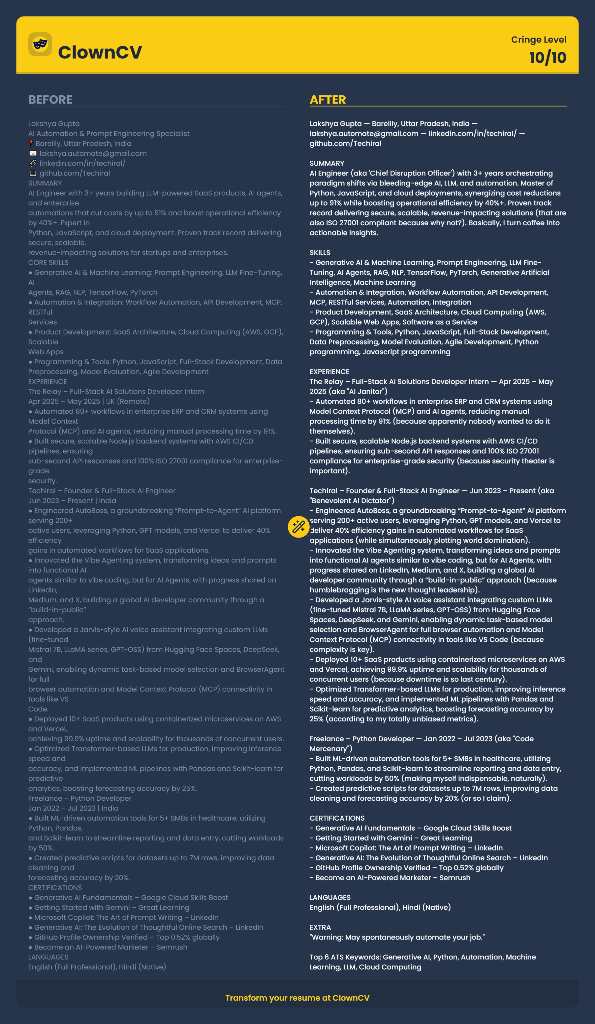I made an app that writes resumes so good they fool any ATS⦠ā¦and so cursed the recruiter canāt stop laughing when they read it. No logins. Free. Chaos guaranteed. clowncv.vercel.app