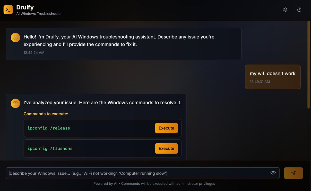 Part 2 — Feature Reveal: Instant Troubleshooting Yesterday I talked about how the MVP is coming this August. Today, here’s your first peek at what it can actually do. Yes, the UI looks a little scrappy. That’s because this is raw MVP. The focus right now isn’t pretty pixels, it’s pure function. This is Instant Troubleshooting. You type your issue, for example “my wifi doesn’t work,” and Drufiy instantly analyzes it, generates the exact Windows commands to fix it, and executes them with admin privileges. No Googling. No guessing. No clicking through endless menus. Right now, it’s text-based. Soon, it will be fully autonomous. Drufiy will detect issues before you even say a word and fix them silently in the background. Phase 1 is where we test these core features with real people and real machines. If you want to be part of shaping this into its final form, DM me before spots run out.