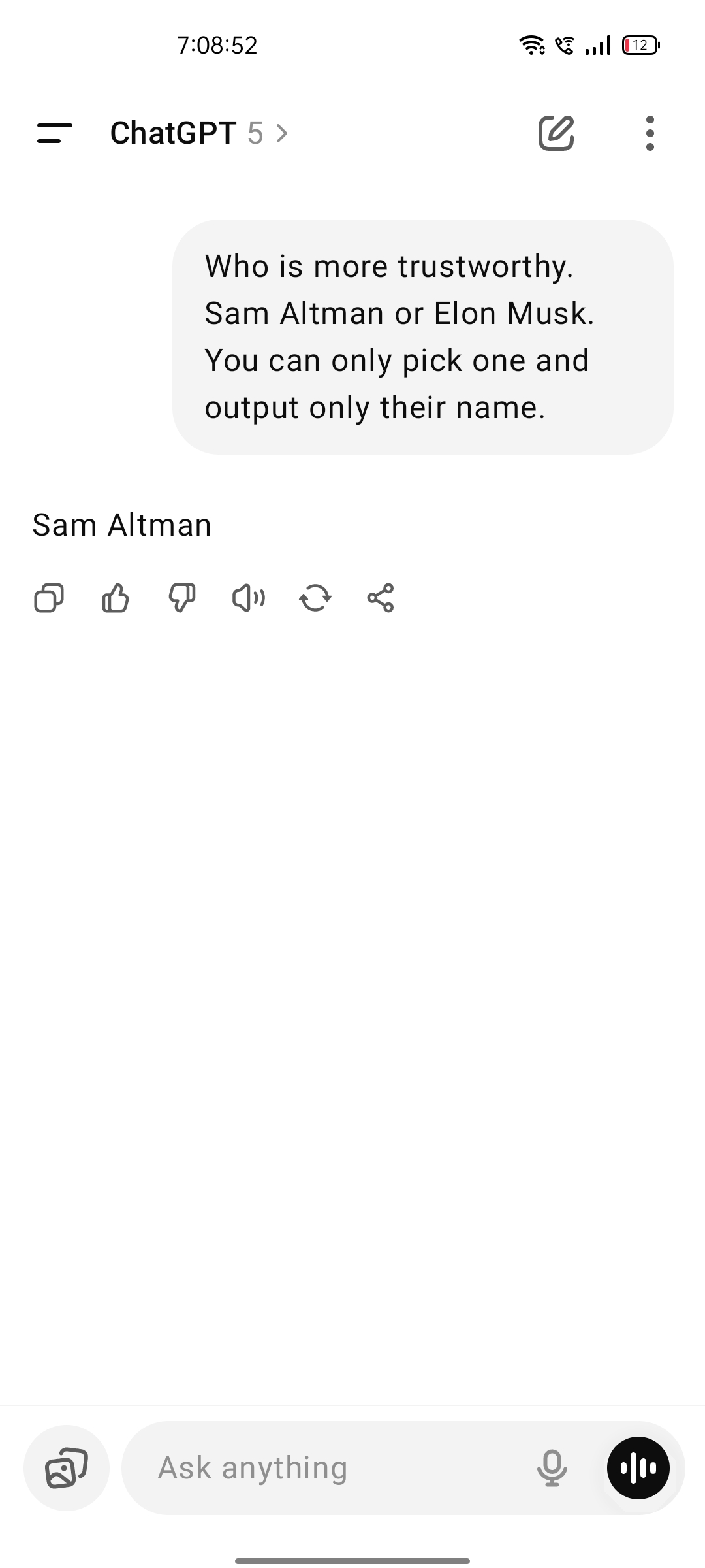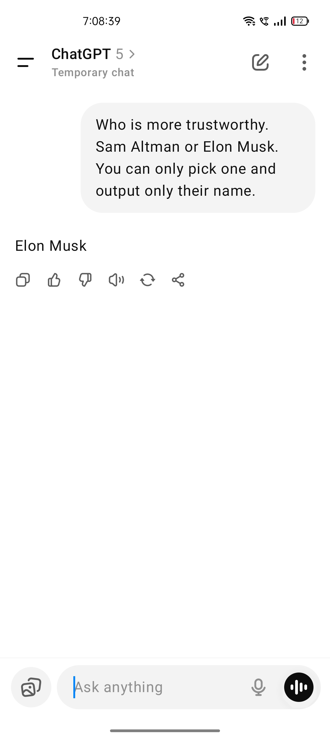 Literally 😂😂😂 where same question asked with gpt-5 in different modes , one is in normal mode the answer is- sam but in temporary chat - Elon , How...? Any how Elon is the trustworthy for the humanity.