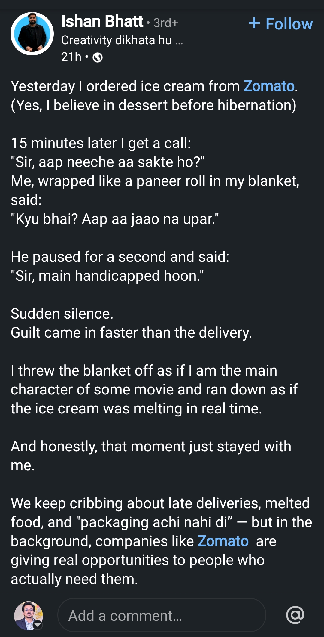 This post made my day. A late-night ice cream order became a huge life lesson, thanks to a story from Ishan Bhatt on LinkedIn. When asked why he couldn't come up, the Zomato delivery partner's simple reply: "Sir, main handicapped hoon." A sudden m