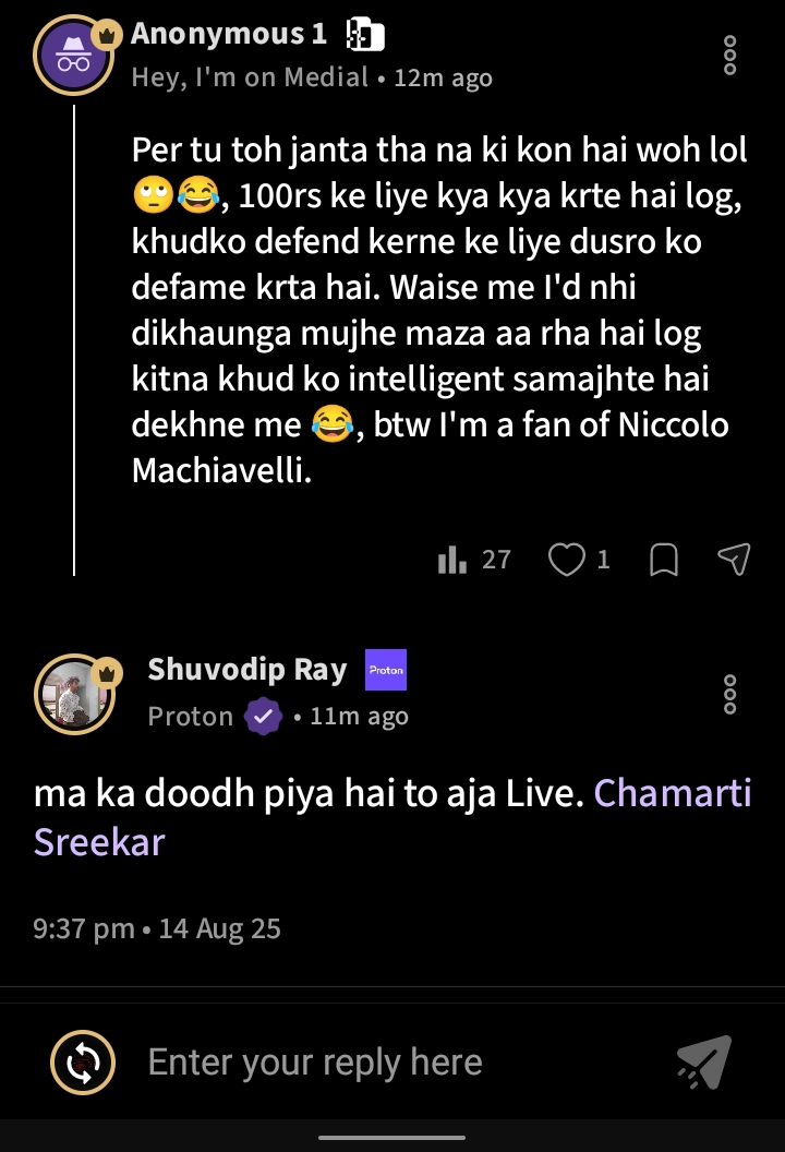 🍿? really ? koi adhe ghante se kuch bhi bake jaa ra and you're enjoying it ? yehi sab karna hota toh twitter hi use karlete medial kyu banare ho phirse then , and lol you call yourself a ""professional platform"" and encouraging all this think twice before you call yourself a professional platform again and if not why this comment still stays though I reported it and its been halfn hour infact any of these anon post about him wasn't by me , none.