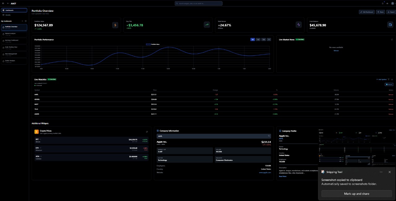 a sneak peek of the website , in progress , for now only forex and crypto but in future as we grow will add indian , uk , europe stocks too . user can use our financial assistant called AAOT- artificial algorithmic omni trade for analysis or will able to manually analyse as all tool will be there for analysis which AAOT will also usee for same analysis