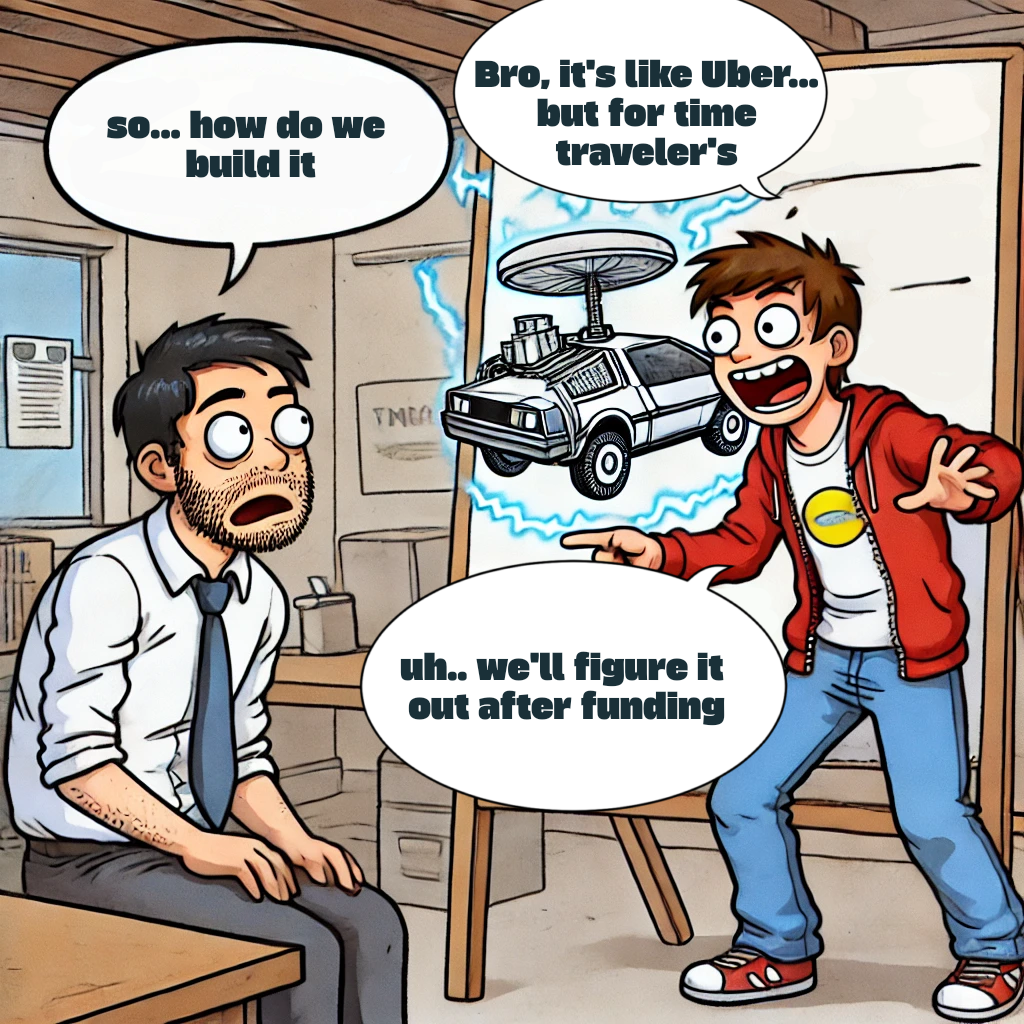 Startup Guy: "Bro, it's like Uber... but for time travelers!" Friend: "So... how do we build it?" Startup Guy: "Uh... we'll figure that out after funding." The joke is based on a common startup stereotype: many entrepreneurs pitch ambitious ideas bu