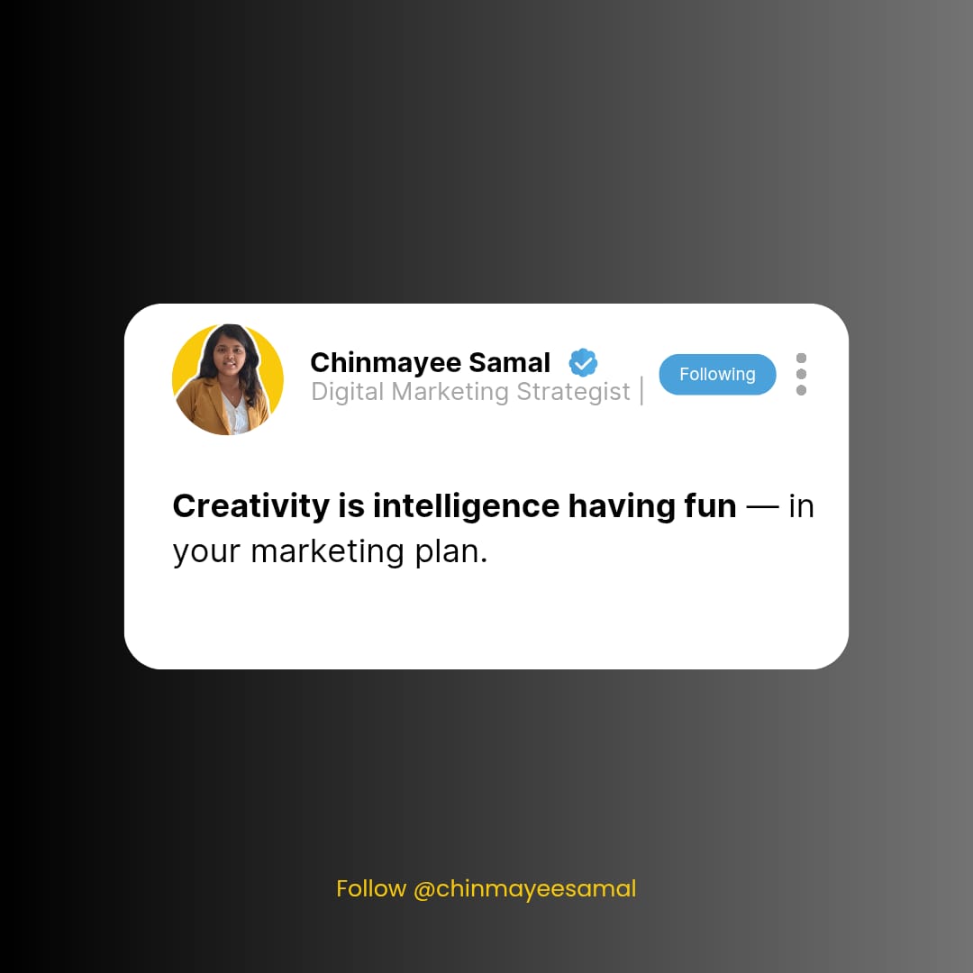 ✨ Creativity isn’t just about ideas — it’s about how smartly you bring them to life! 💡 Make your marketing plan fun, smart, and unforgettable. 🚀 👉 Follow CHINMAYEE SAMAL for more marketing insights, creativity tips & brand growth hacks! #Digital