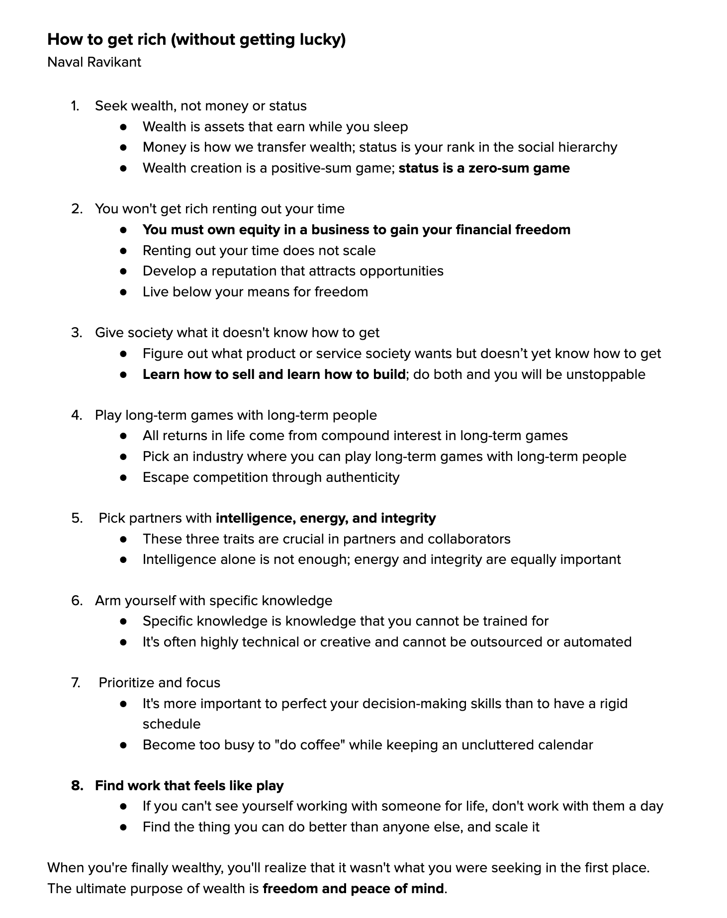Naval Ravikant on How to Get Rich (without getting lucky) " I like to think that if I lost everything and landed on a random street in any English-speaking country, within 5,10 years I'd be wealthy again. Because it's a skill set that I've developed