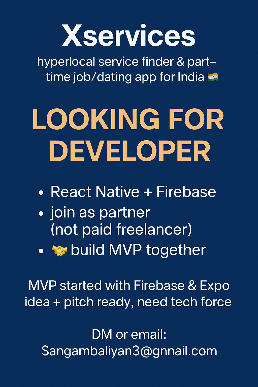 🚀 Building Xservices – a hyperlocal service finder app (like Urban Company + part-time job/dating) for India 🇮🇳 We’re looking for a React Native + Firebase developer to join as a partner, not paid freelancer. 🤝 Build together, grow together 📱