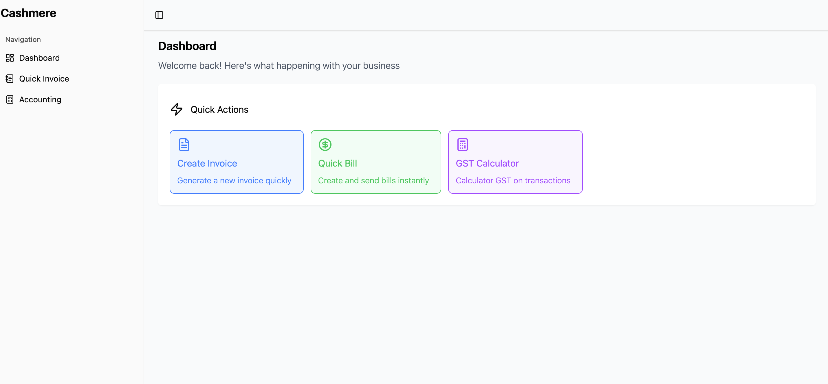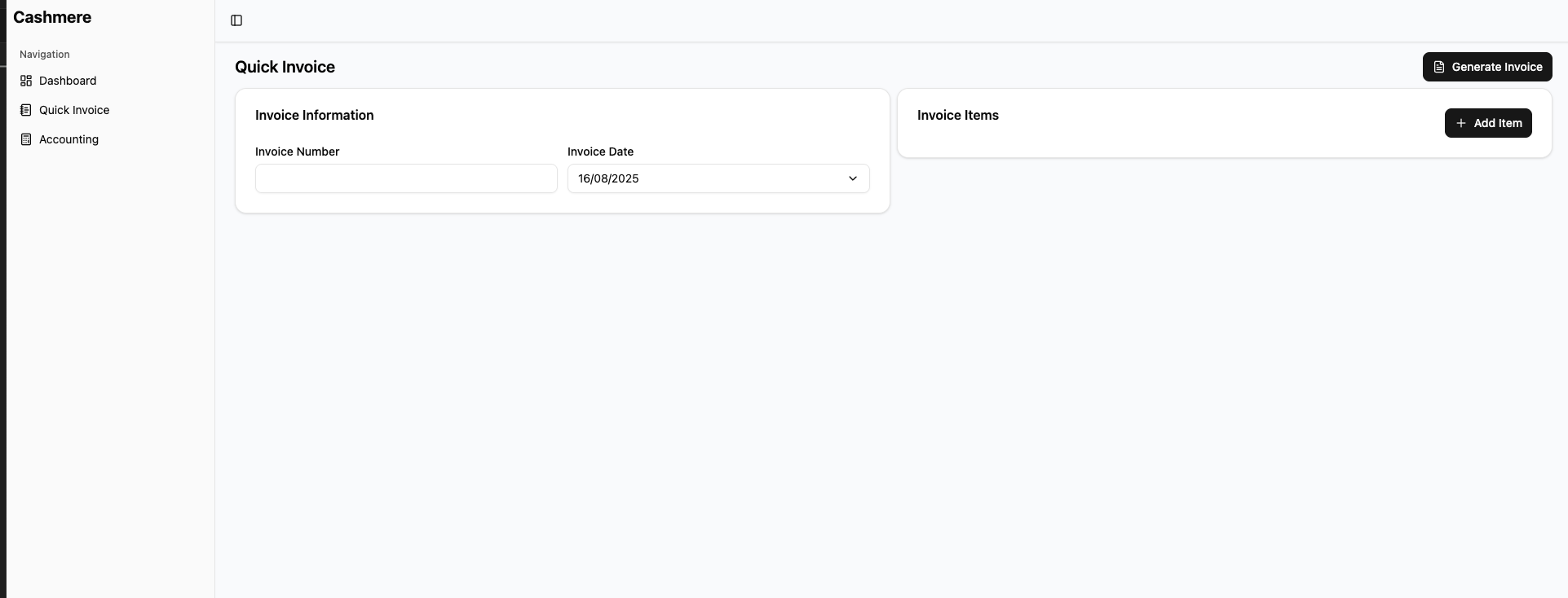 Day 2 of building a personal project - Cashmere ERP dashboard. Today I completed the basic dashboard and Quick Invoice screens , and implemented core navigation with modern UI components.