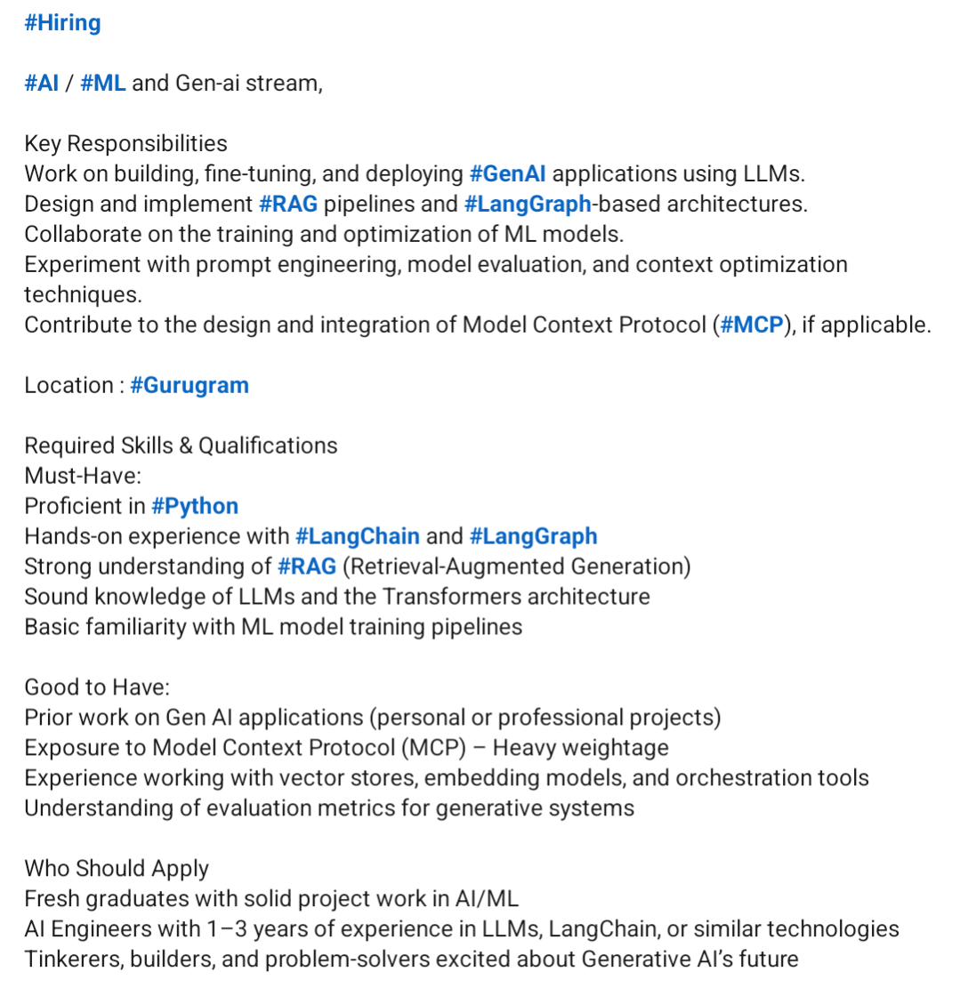Hello there people, I am hiring for an AI/ML Engineer position at our company. Please let me know if someone is interested or pass on the info if you know someone who's interested. NOTE: We are also hiring an intern for the same position as well.
