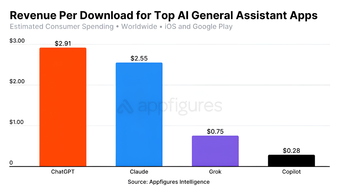 𝗧𝗵𝗶𝘀 𝘆𝗲𝗮𝗿 𝗮𝗹𝗼𝗻𝗲, 𝗖𝗵𝗮𝘁𝗚𝗣𝗧’𝘀 𝗺𝗼𝗯𝗶𝗹𝗲 𝗮𝗽𝗽 𝗺𝗮𝗱𝗲 $𝟭.𝟯𝟱 𝗯𝗶𝗹𝗹𝗶𝗼𝗻 (₹𝟭𝟭,𝟬𝟬𝟬+ 𝗰𝗿𝗼𝗿𝗲). 𝗧𝗵𝗮𝘁’𝘀 𝟲𝟳𝟯% 𝗴𝗿𝗼𝘄𝘁𝗵 𝗶𝗻 𝗼𝗻𝗲 𝘆𝗲𝗮𝗿. Claude is second in revenue per download, but it doesn’t matter — ChatGPT dominates downloads. Globally, ChatGPT has been downloaded ~690 million times. Grok? Just 39.5 million. Not even close. In 2025 alone, 318 million downloads. That’s almost 3x more than 2024. In India, I’ve seen college students using ChatGPT to pass exams, shopkeepers asking it to write WhatsApp forwards, and startup founders using it to pitch investors. For most people, ChatGPT isn’t “one of the AIs.” It is AI. That’s the brutal truth: outside the tech bubble, no one cares about Claude, Grok, or Anthropic. In India and globally, AI = ChatGPT. If someone wants to beat them, they need more than a “better model.” They have to break a cultural lock-in. That’s 100x harder than just building tech.
