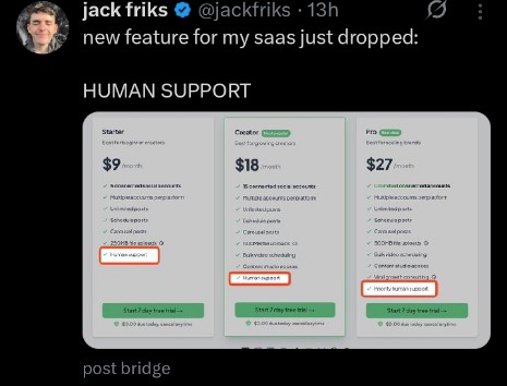 In a world where every SaaS is rushing to add “AI support” he added human support as a new feature. 👀 Sounds funny, but it also says a lot Maybe the real innovation today is going back to basics...
