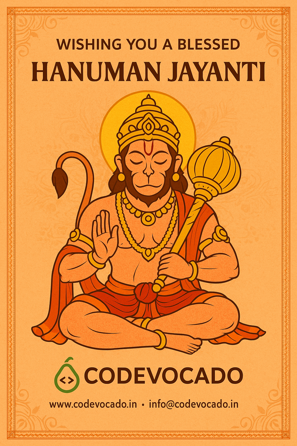 Wishing you strength, courage, and wisdom this Hanuman Jayanti! May the divine blessings of Lord Hanuman guide you always. Team Codevocado celebrates the spirit of resilience and devotion. www.codevocado.in | info@codevocado.in #HanumanJayanti #Code