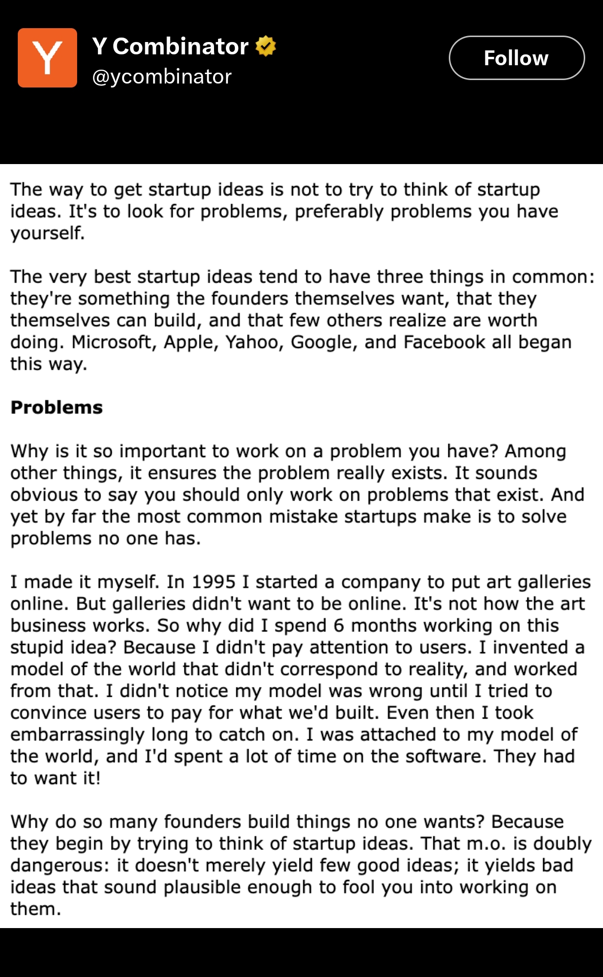 Paul Graham (Co-founder, Y Combinator) "The way to get startup ideas is not to try to think of startup ideas. It's to look for problems, preferably problems you have yourself." The best startup ideas come from solving real problems, not just brain