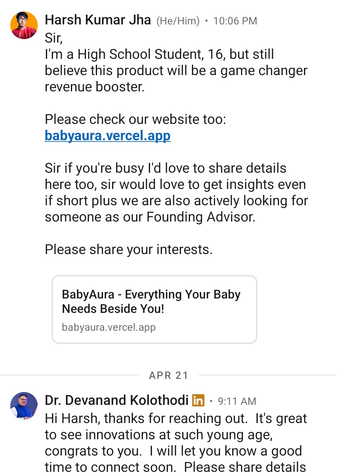 Looking back This was My first MESSAGE to Dr. Devanand (Fmr. Regional CEO of Aster DM Healthcare), April 21 and August 19 truly brought lots of changes. From ColdDM to Advisor From Vercel site to babyaura.in Progress 🙌