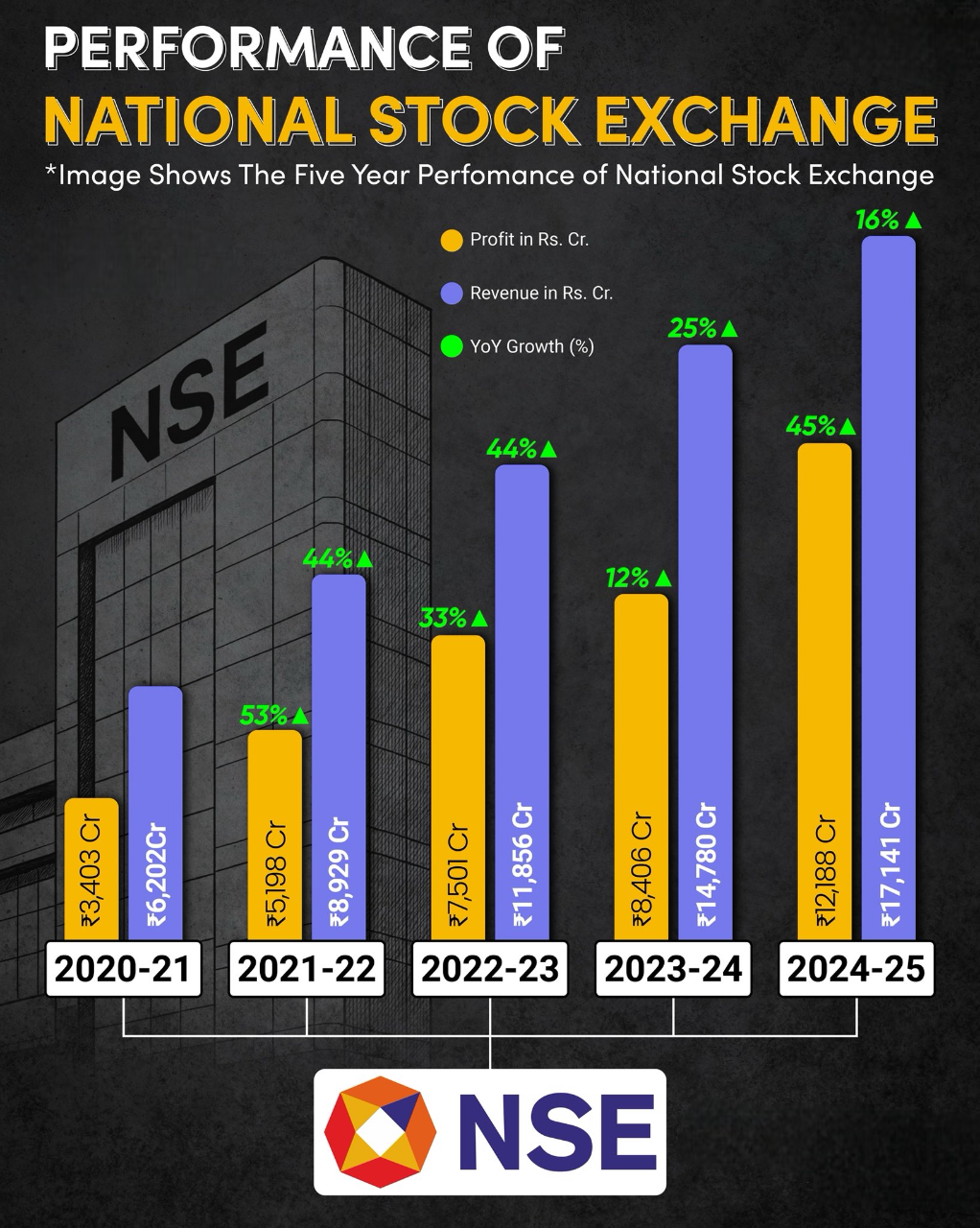 Performance of National Stock Exchange (NSE) 5 Year Report The National Stock Exchange (NSE) has showcased consistent growth over the last 5 years. Highlights (2020-21 to 2024-25): ✅ Steady increase in Revenue & Profit ✅ Strong YoY Growth – peaking at 53% in 2021-22 ✅ Profits surged from ₹3,403 Cr in 2020-21 to ₹12,188 Cr in 2024-25 ✅ Revenues rose from ₹6,202 Cr to ₹17,141 Cr in the same period NSE continues to be a pillar of India’s financial market, driving transparency, innovation, and investor confidence.