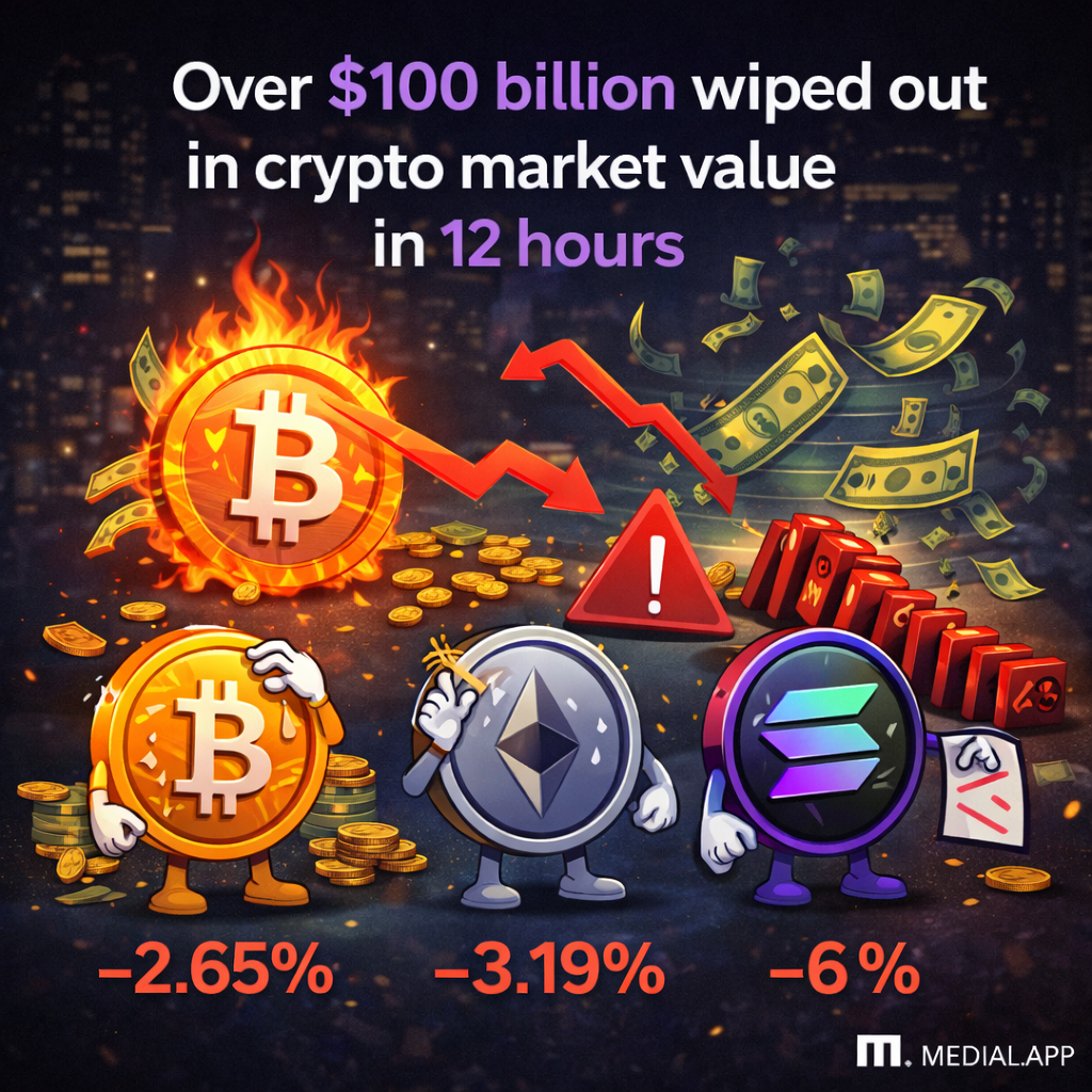 Over $100 billion in crypto market value disappeared in just 12 hours.. Bitcoin dropped 2.65%, Ethereum 3.19%, and Solana more than 6%. On-chain data shows that exchange outflows rose before the decline, signaling that large holders were reposition