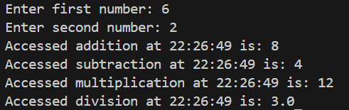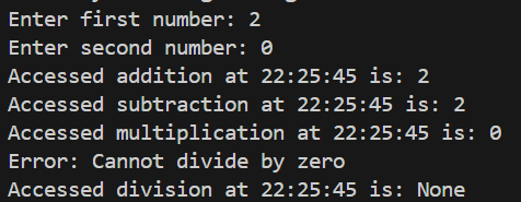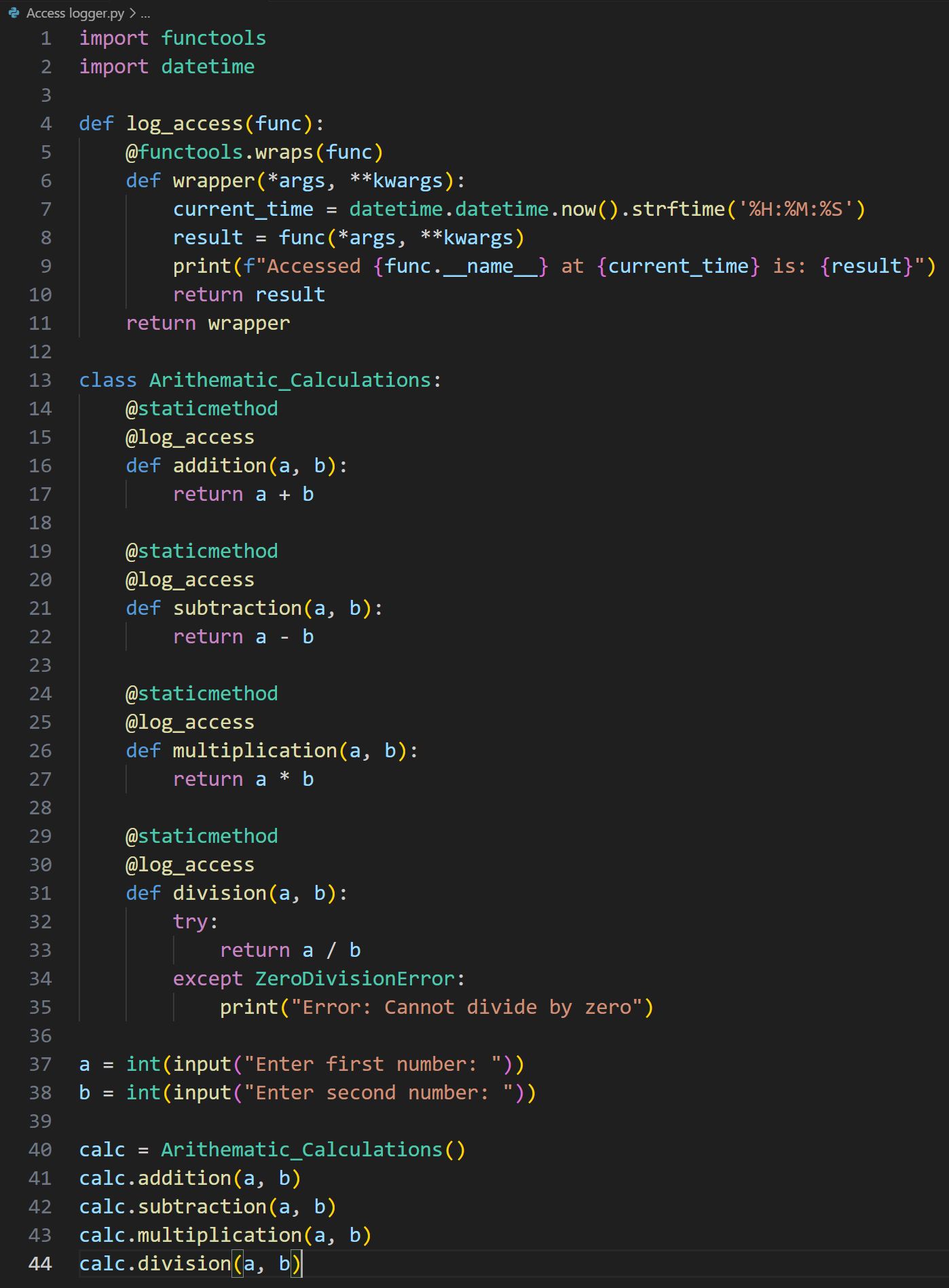 Day 24 of learning python as a beginner. Topic: decorators Somebody has suggested me that I should focus on some of the important things and he gave me a list of topics to learn. Decorators were at very top of that list and therefore I decided to learn what decorators really are in python. A decorator is a function that helps us to expand and modify another function without changing its source code for example in my case I wanted that user is able to see the time at which he performed an arithmetic calculation. I had two ways of achieving this first the most simple and basic: is to just use the same line everywhere or make a function of this and call it just before the calculations. However this may not be the very efficient way because it may cause repetition of same lines which may unnecessarily increase the line of code and may not be very readable. This is where decorators come to save is you just need to create a function then wrap it by using functools's wrap function () to preserve the important meta data and then you need to use *args (arguments stored as a tuple) and **kwargs (arguments stored as a dictionary). For applying this to next function you just have to write @function_name_here. Decorators are of four types: 1. Function decorator: these are applied to regular functions (just like in our example). 2. Method decorator: these are used specifically methods defined in class (I used this in my code). 3. Class decorator: these are applied directly to the class as a whole. 4. Built-in-decorator: python also offers some built in decorators to use with the class (I used @staticmethod decorator, this removes the need of putting self in the code). some commonly used decorators are @staticmethod, @classmethod, @property, @user_defined_decoratort etc. There are a lot of decorators however I have used user defined decorators (to create a logger) and static method decorator (because I didn't wanted to use self here) by doing I also realised that you can use more than one decorator in a single function. And Here's my code and it's result.