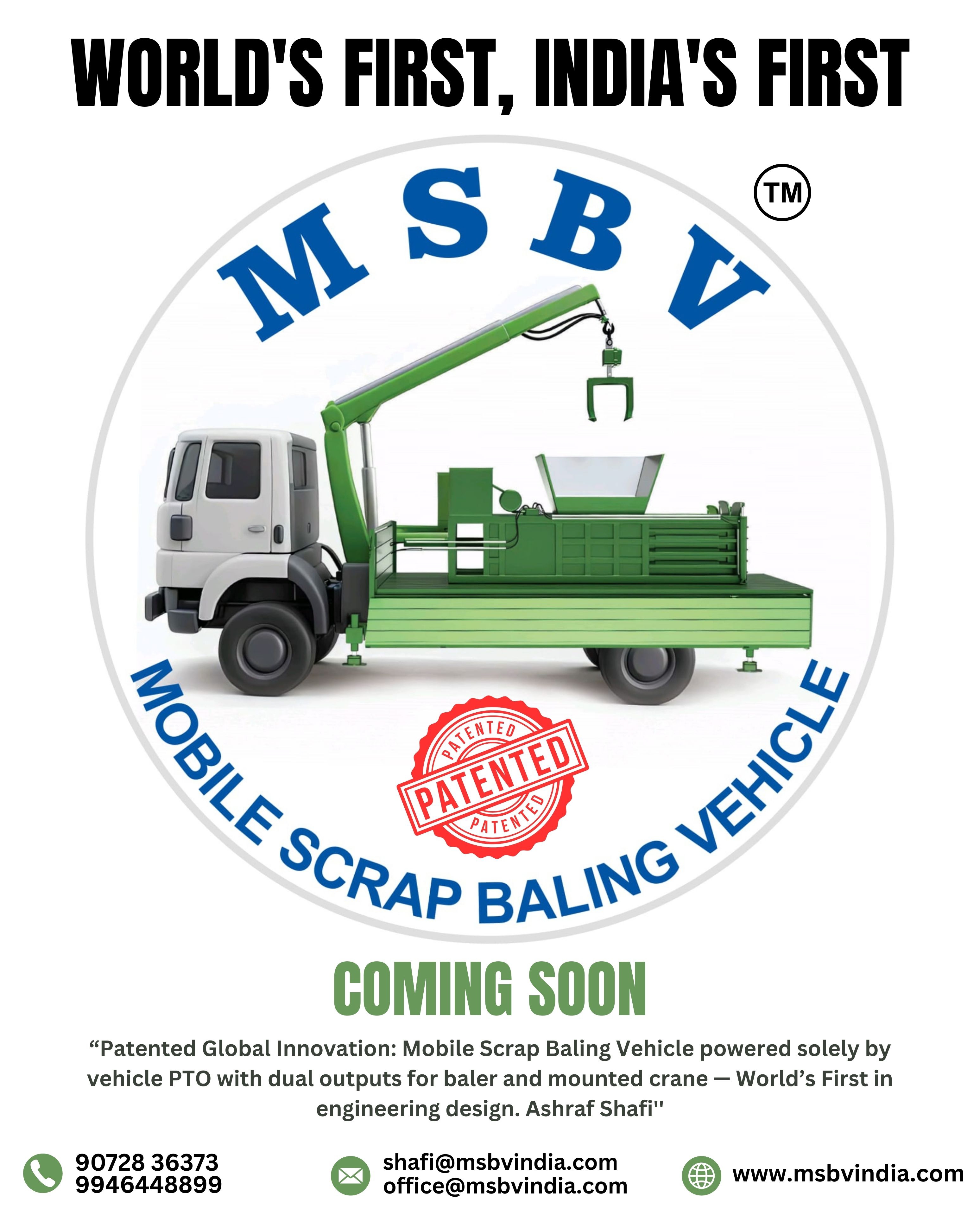 “Patented Global Innovation: Mobile Scrap Baling Vehicle powered solely by vehicle PTO with dual outputs for baler and mounted crane — World’s First in engineering design. Ashraf Shafi''