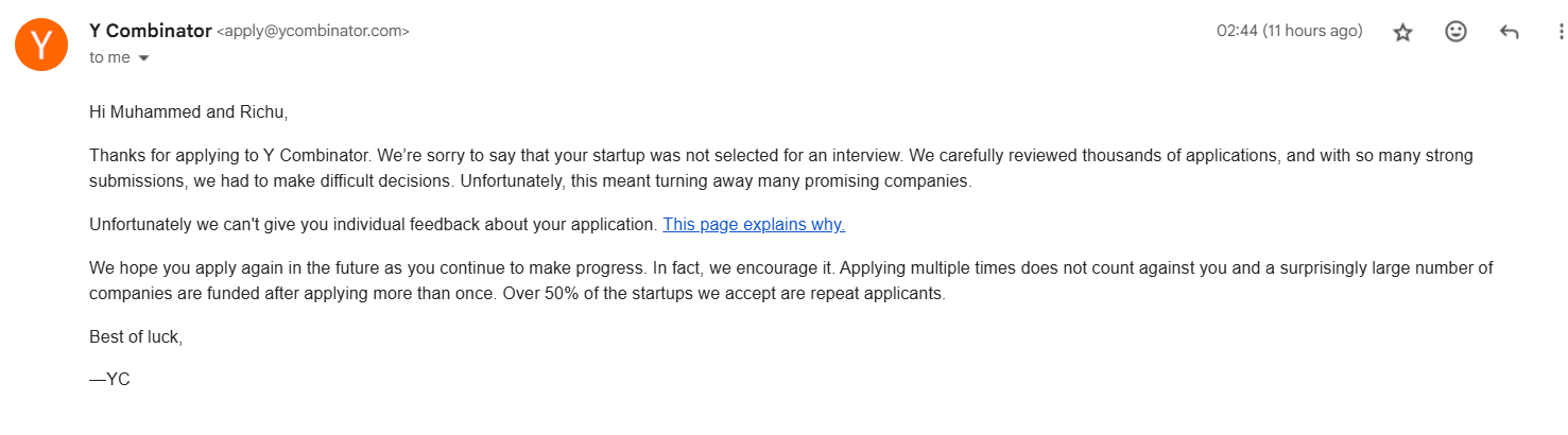 We got rejected from Y Combinator. Yesterday, we received the email that every founder both anticipates and dreads. Our application didn’t make it through. At first, it stung because YC is a dream platform for any early-stage founder. But when the