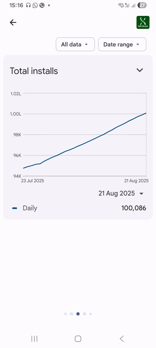 Set2score Completed 1L + downloads recently. Slow but a consistent growth ๐ฅ. Mob app : https://play.google.com/store/apps/details?id=in.set2score.set2score Web app : https://www.set2score.com/