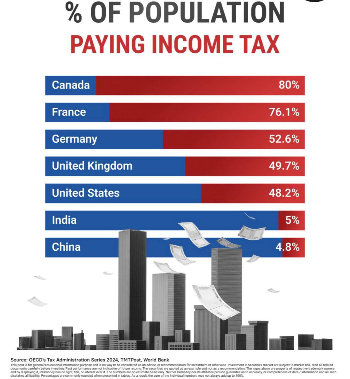 The real minority in India is the 5% of people who pay taxes In China it’s around 4.8% still one of the main reasons behind China’s growth could be the strong control their government has over almost everything.