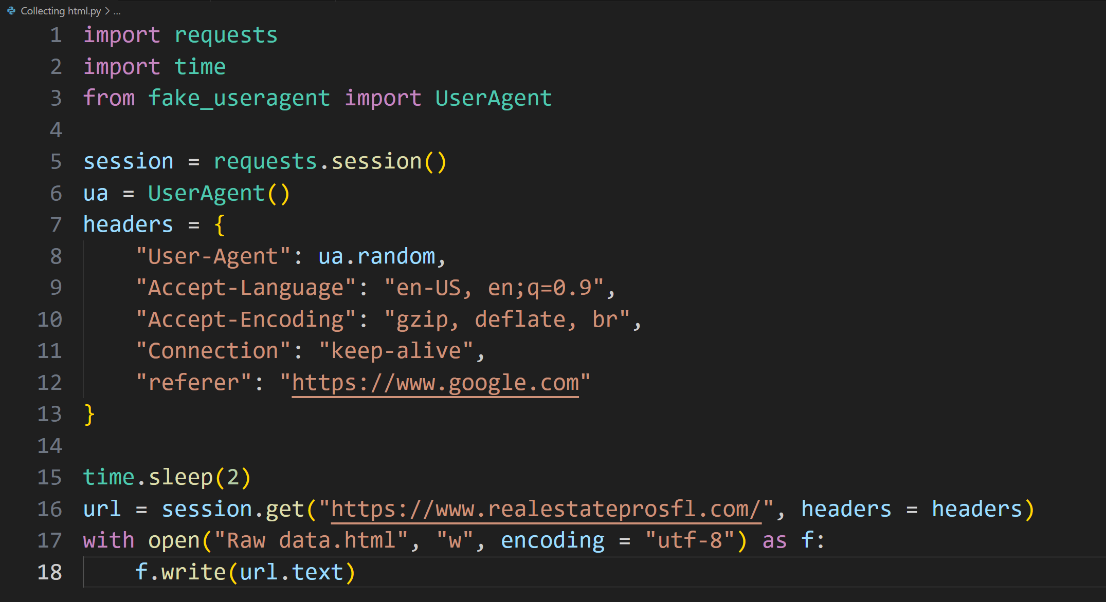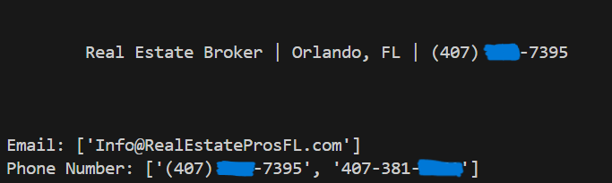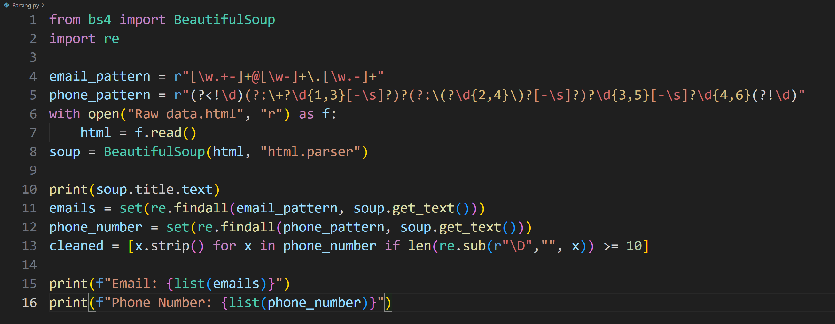 Day 27 of learning python as a beginner. Topic: web scraping using beautiful soup. A few days ago I got introduced to requests library in python which can scan the html from websites. At that time I was confused on what might be the real life implications of it that's when many amazing people guided me that most of its implications are in web scraping (something which I wasn't aware about then). Web scraping is essentially extracting data from websites (in html format) and then parsing it to extract useful information. There are mainly two libraries used for web scraping 1. Beautiful Soup and 2. Selenium some say Scrapy is also good for this purpose. I have focused on beautiful soap and was successful in scraping data of a real estate website. First I used requests and File I/O to save the html data (many people say that there's no need for it however I think that one should save the data first in order to avoid unexpected errors from website or to avoid repeat scraping when you want to extract more information from the same data). At first the website was forbidding me for scraping html data therefore I gave a time delay of 2 second because sending too many requests to the server is a common signal that I am scraping data. Then I used fake user agent to create a realistic user agent and manipulated browser header so that the request seem more legitimate. Once I got all the HTML data saved in a file I used Beautiful Soup to parse the data (Beautiful soup converts raw html into structured parse tree). I identified my goal as extracting the email and phone number (which I hid obviously) from the website and for this purpose I used regular expressions (regrex [I finally got some understanding of this]) because it helps me create patterns which can be used to identify the text which I require (email and phone number) although I created the pattern of email myself however took AI's help to design the pattern of phone number (it was a bit challenging for me). I have performed all this on a single website and in future I have plans to do this in bulk (I may require proxies for those to avoid IP ban) and then I can enter all that data in the database using PostgreSQL. I also have to learn Selenium because I believe it may also have its own implications (correct me if I am wrong). And here's my code and it's result.