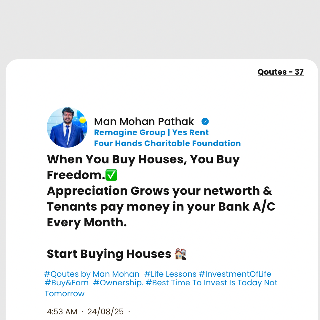 When You Buy Houses, You Buy Freedom.✅ Appreciation Grows your networth & Tenants pay money in your Bank A/C Every Month. Start Buying Houses 🏘️