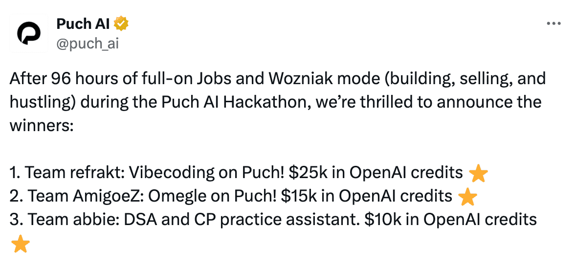 Excited to share that our team secured 3rd place in the Puch AI 96-hour hackathon, where we built a DSA and CP practice assistant on the Puch platform. It was a great experience collaborating and innovating under such an intense timeline. We were awa