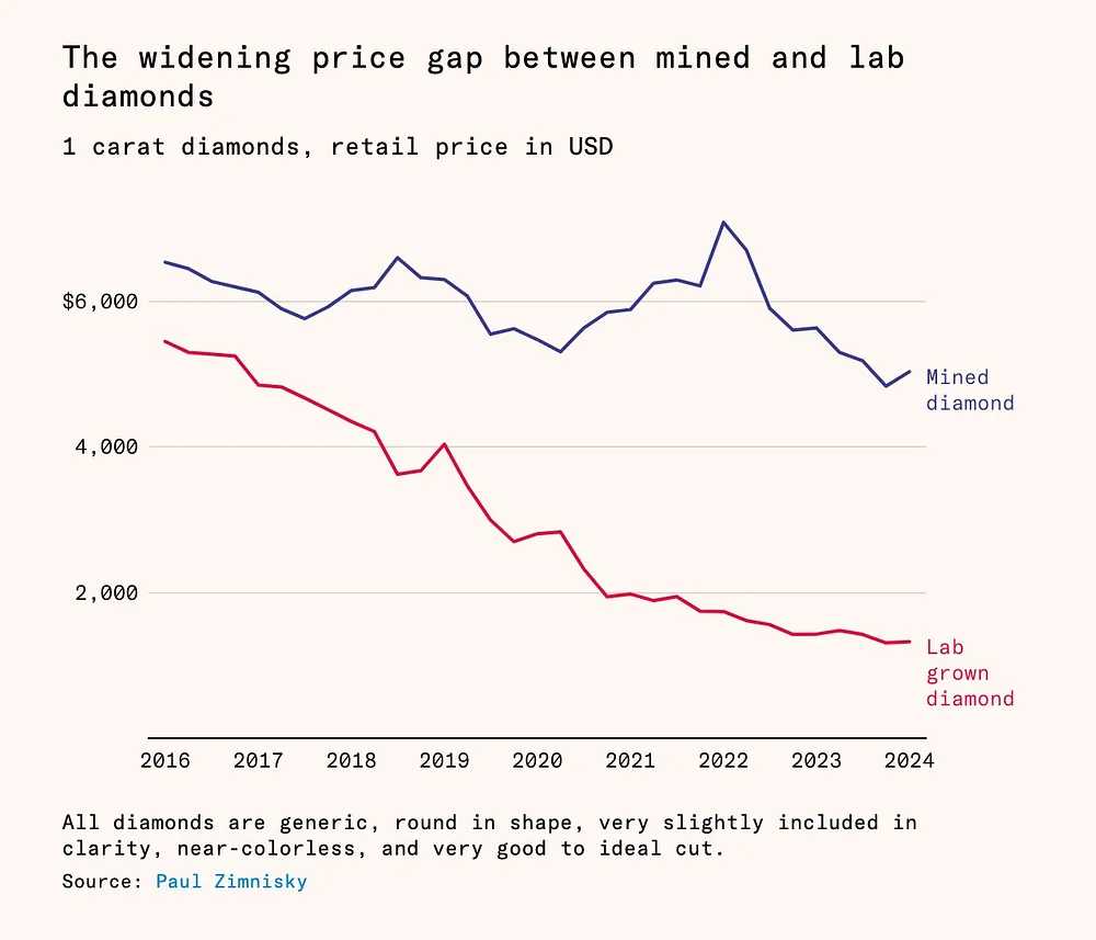 Lab grown diamonds are almost identical to real mined diamonds. You cannot distinguish between the two with your naked eyes. However, the price difference among them has been widening over time. Is this just because Mined diamonds are 'perceived'