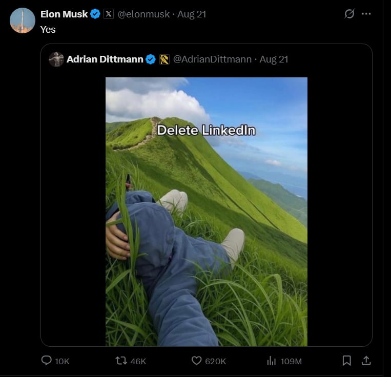 Nowadays people be like Linkedin id overrated but it's like Delete Linkedin? That's like Jeff Bezos saying ' don't order online ' what if you'll agree 👍 Elon. Next you'll tell us to quit jobs and live on Mars ..