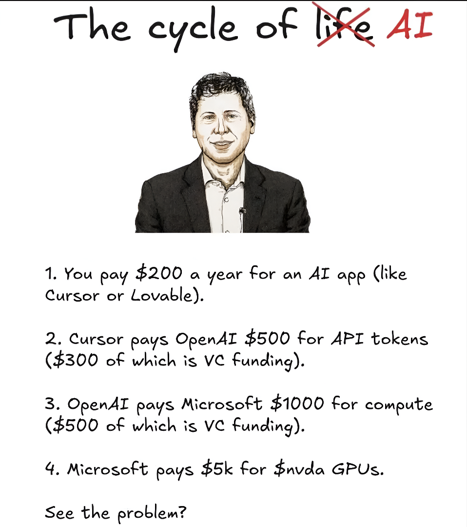 𝗔𝗜 𝗳𝗲𝗲𝗹𝘀 𝗹𝗶𝗸𝗲 𝗮 𝗴𝗼𝗹𝗱 𝗿𝘂𝘀𝗵. 𝗕𝘂𝘁 𝗺𝗼𝘀𝘁 𝗺𝗶𝗻𝗲𝗿𝘀 𝗮𝗿𝗲 𝗯𝗿𝗼𝗸𝗲. Look where the money really goes: 1. You pay $200 for an AI app (like Cursor, Jasper, Lovable). 2. The startup sends $500 to OpenAI for API usage (mostly burning VC money). 3. OpenAI pays Microsoft $1,000 for cloud servers (also burning VC money). 4. Microsoft spends $5,000 on NVIDIA chips to power those servers. Who wins? NVIDIA – sells chips, prints record profits. Microsoft/AWS/Google – rent out compute and take a cut. Who struggles? Most AI startups – just middlemen calling OpenAI’s API, burning investor money. Even OpenAI – huge revenue but insane infra costs; still relies on massive outside funding. Examples: Jasper grew fast but struggles with retention and infra costs. Many AI apps fully depend on OpenAI — if costs rise or APIs change, they’re at risk. Meanwhile, NVIDIA keeps breaking profit records every quarter. The reality: most of the money flows up to infra giants, while the majority of AI players are barely surviving on hype and investor cash.