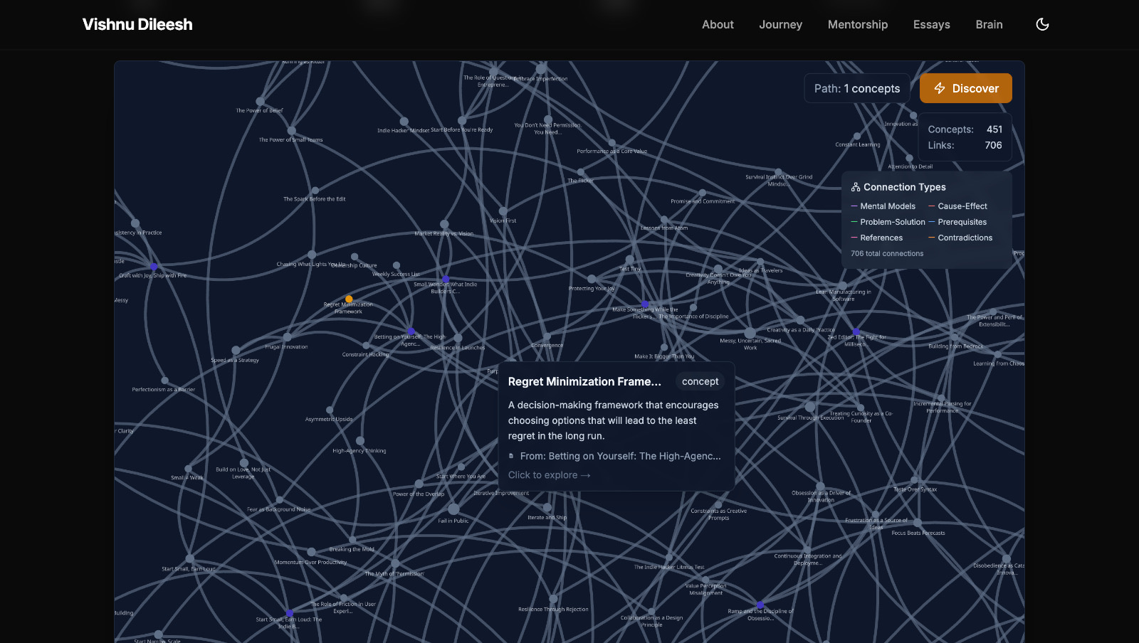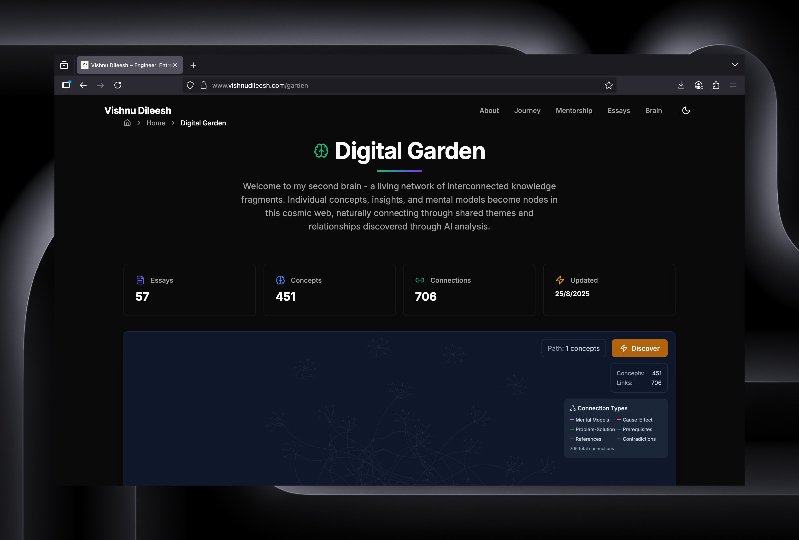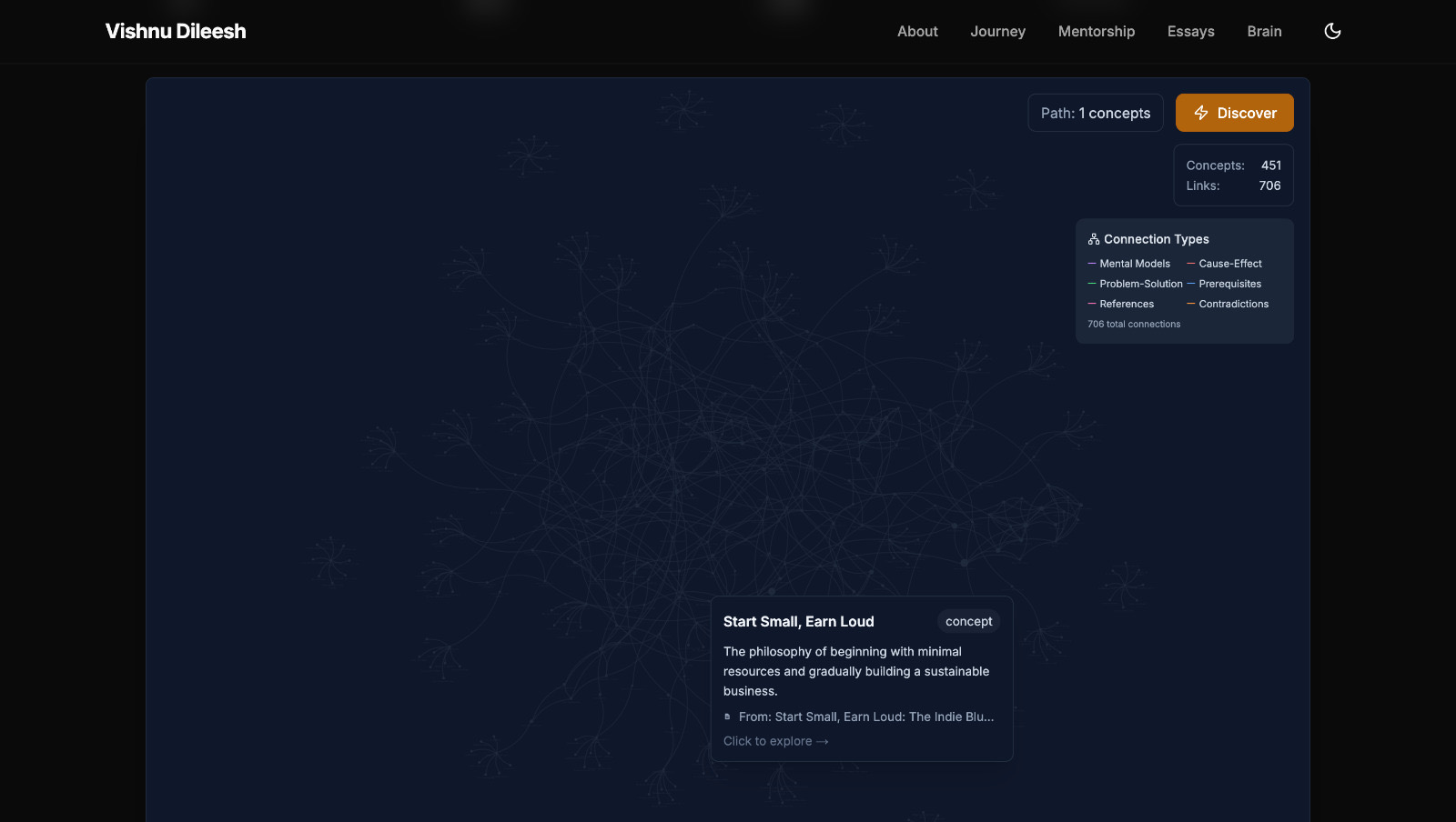 The Digital Garden is finally ready. 451 concepts, 706 connections for just 57 essays. Imagine the second brain on 500th essay. (My ReadWise holds over 6000 highlights weighting to be turned into essays) https://www.vishnudileesh.com/garden