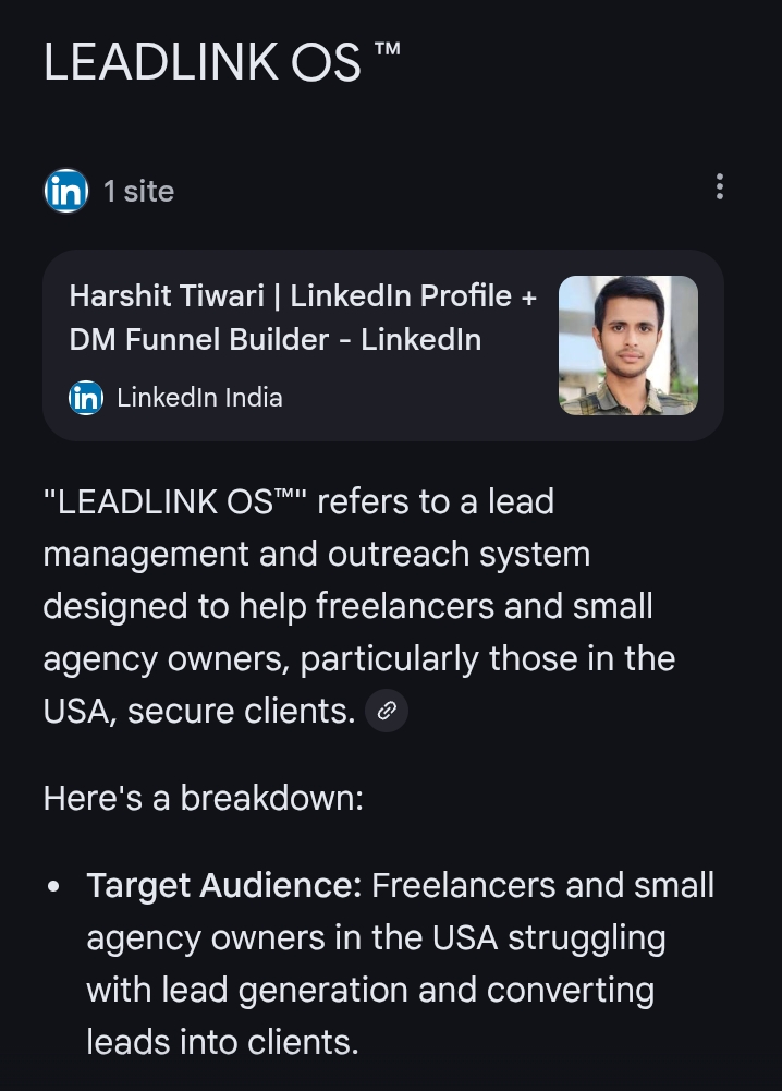 A few months ago, I quietly built something called LEADLINK OS™—a system designed to help freelancers and small agency owners (especially in the US) turn cold LinkedIn profiles into warm client pipelines. No ads. No SEO hacks. No paid PR. Just strategic content, clarity of positioning, and consistent outreach. Last week, I discovered something wild: Google indexed my system organically. No push. Just pull. Why does this matter? Because it proves that: ✅ Authority compounds when you build systems, not just posts ✅ Niche positioning beats generic visibility ✅ Organic reach isn’t dead—it just needs precision If you’re a freelancer or consultant trying to stand out in a crowded feed, here’s my advice: ✓ Name your system. ✓ Solve one painful problem. ✓ Make it so clear that even Google wants to read it. Want a peek inside LEADLINK OS™? Drop a 🔗 or DM me “Leadlink” and I’ll send over a breakdown.