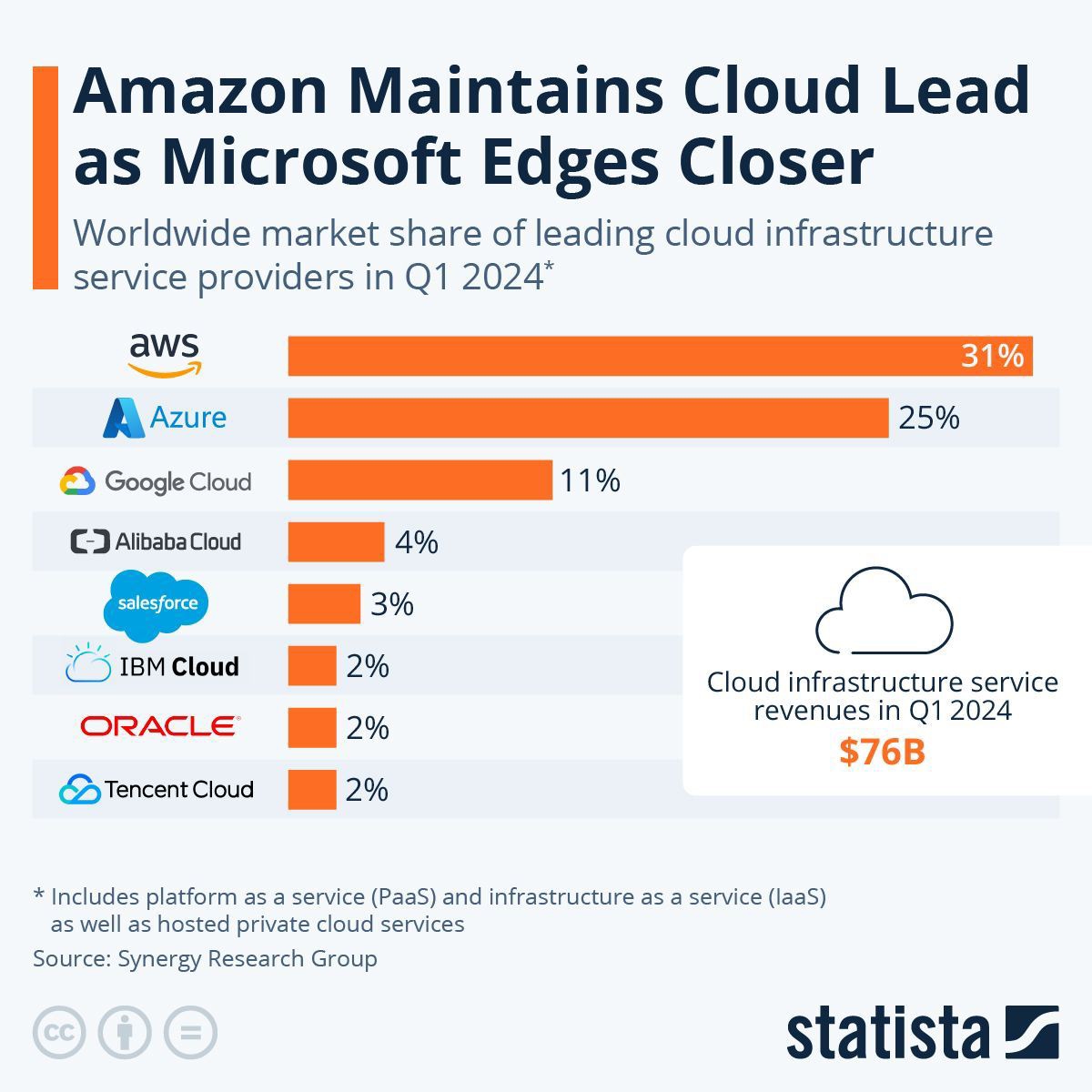 โผ๏ธ Amazon Web Services (AWS) is still leading the cloud game, owning 31% of the market in Q1 2024. But Microsoft's Azure is catching up, hitting a record 25% market share. With Google at 11%, the "Big Three" now control two-thirds of the $76-billion