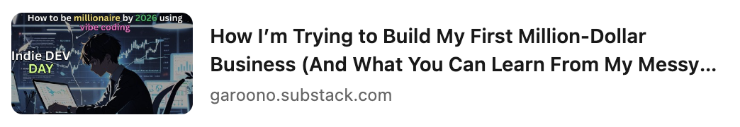 Do you believe its possible? Lets connect - vibe coder - investors - co-founders - flutter devs - marketing person - Action takers https://garoono.substack.com/p/how-im-trying-to-build-my-first-million?r=6cys52